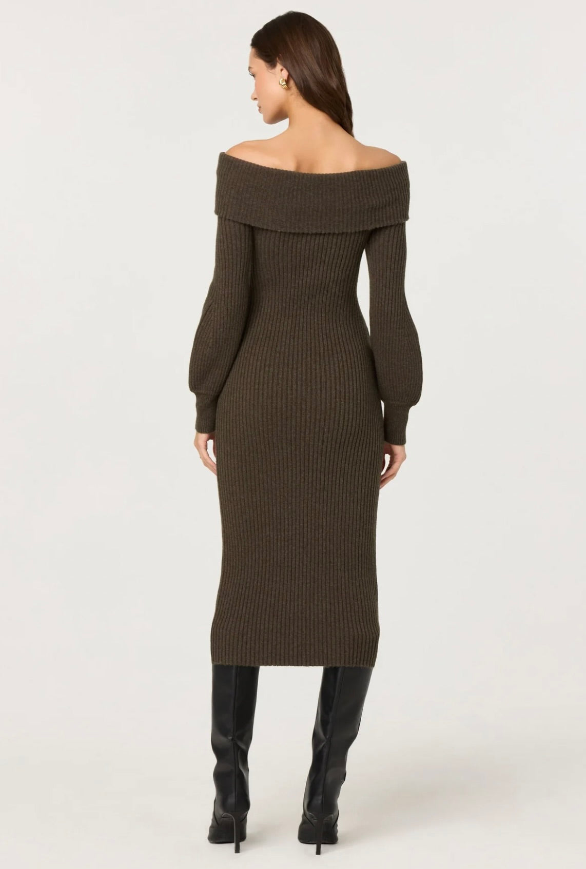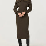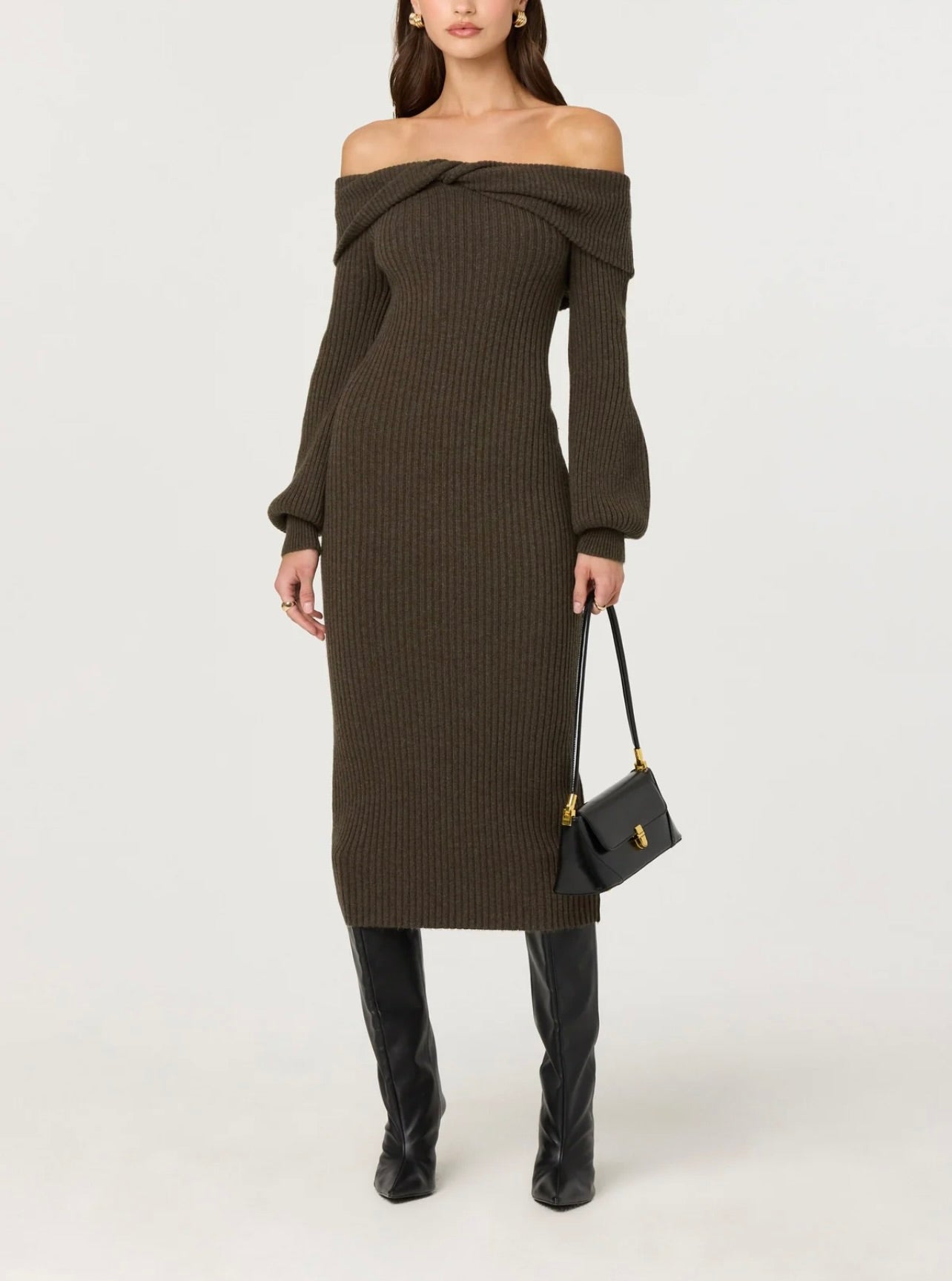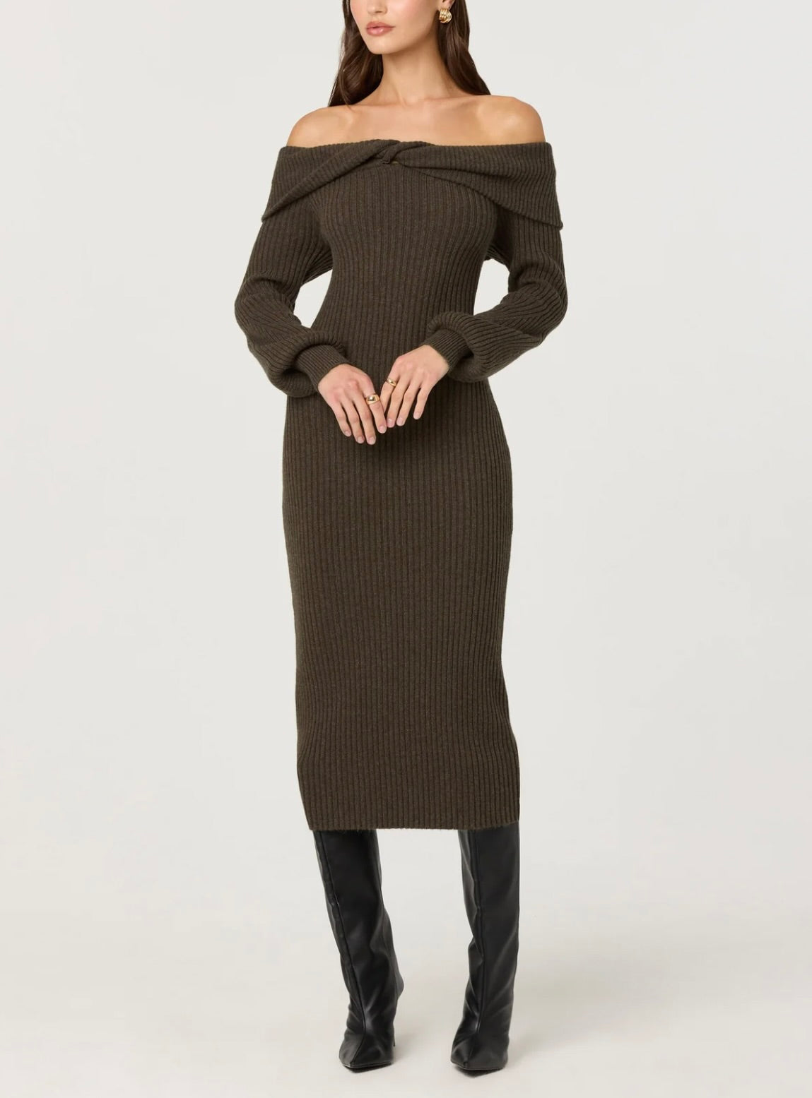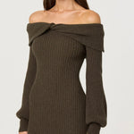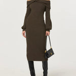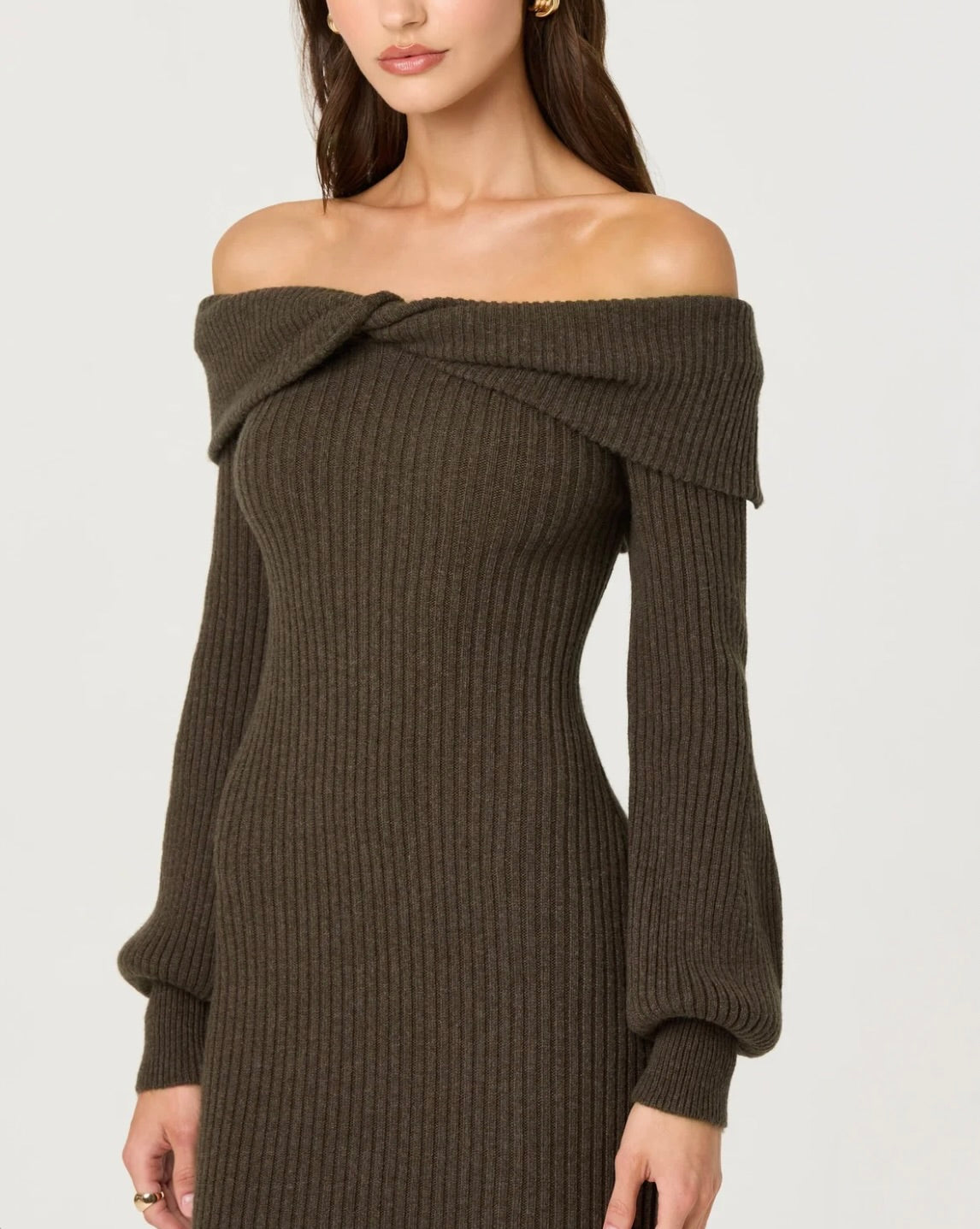 This off-shoulder sweater dress brings understated elegance to your everyday wardrobe. The graceful foldover twist front and softly voluminous balloon sleeves with contrasting ribbed accents create visual interest while maintaining sophisticated composure. A versatile piece that transitions seamlessly from boardroom to after-hours with refined ease.