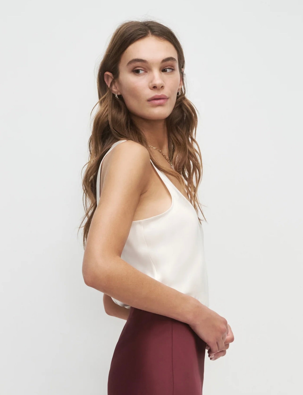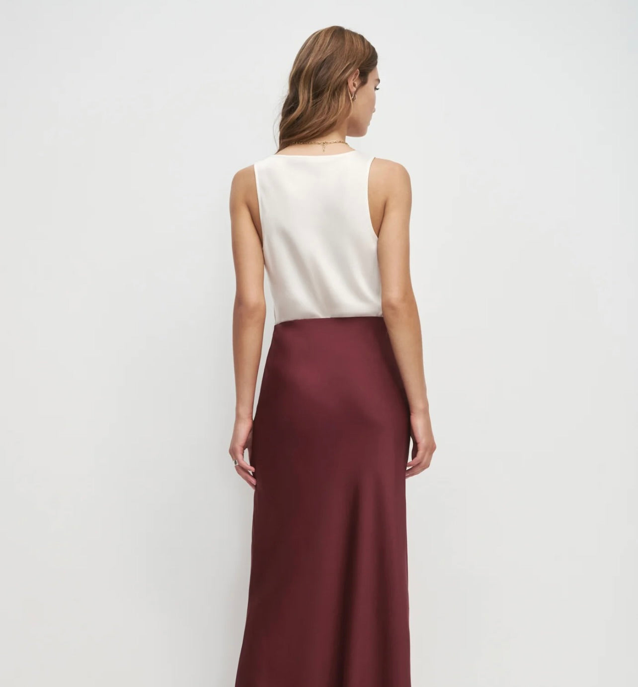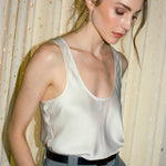 The Clean Cut Tank embodies understated elegance with its refined silhouette and luxurious satin fabric. The deep U-neckline creates a flattering, versatile look—polished enough to layer beneath a tailored blazer for the office, yet striking enough to stand alone for evening wear. Clean lines and a fluid drape make this piece a sophisticated wardrobe essential that transitions effortlessly from day to night.