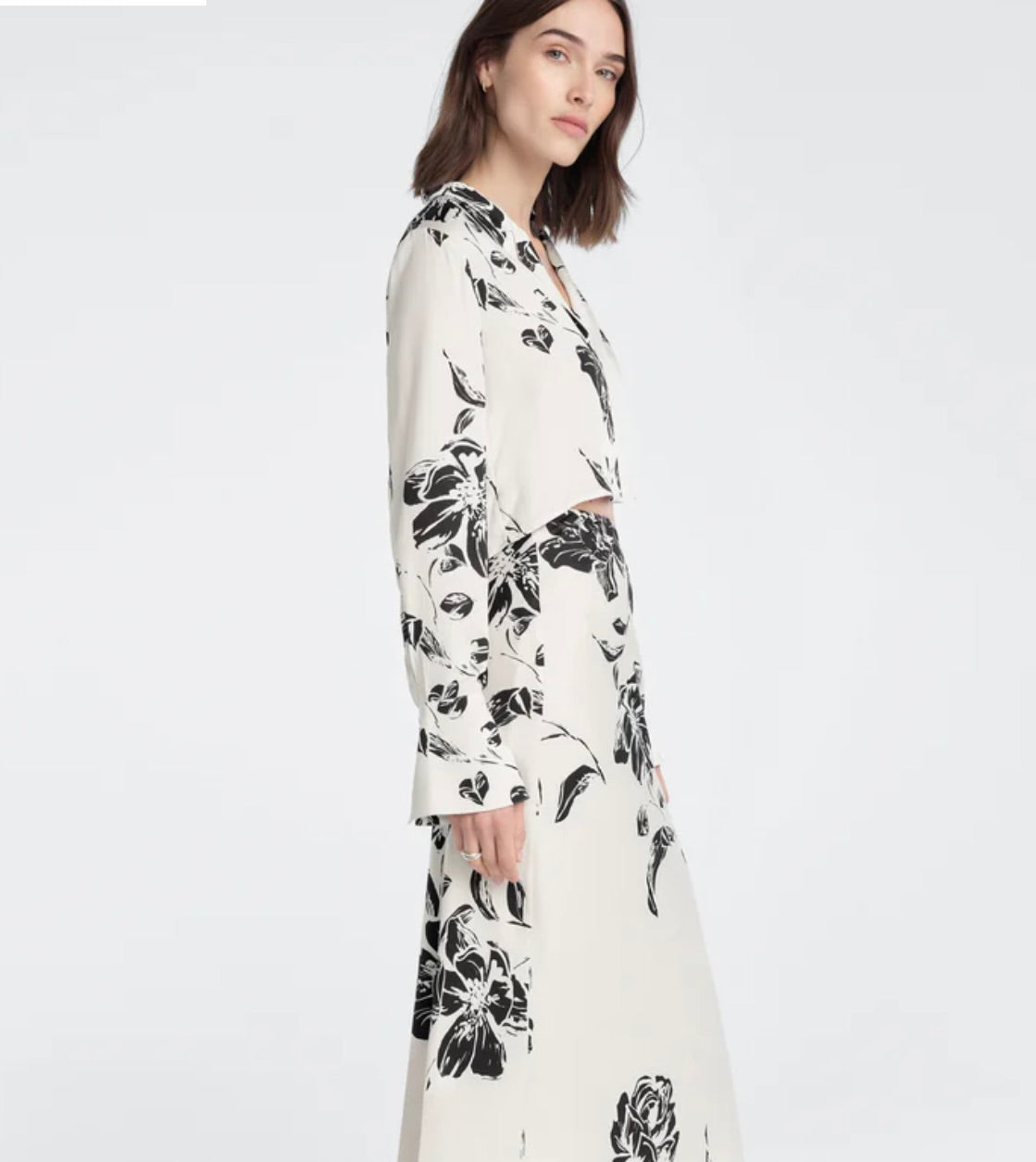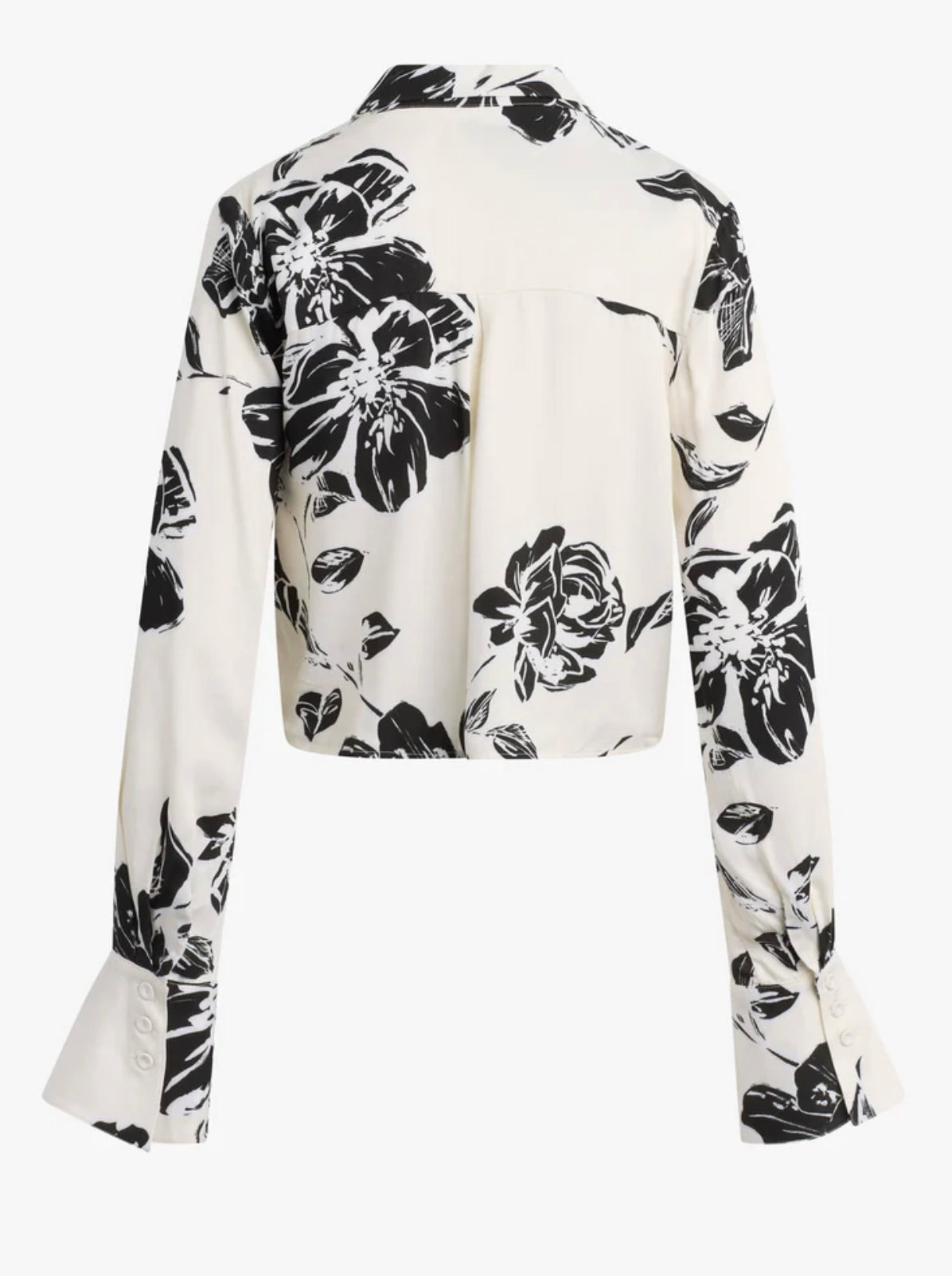 An effortless wardrobe essential that transcends seasons. The Cropped Lily Shirt features luxurious satin in a refined silhouette with a sharp, pointed collar and statement cuffs that elevate any look.