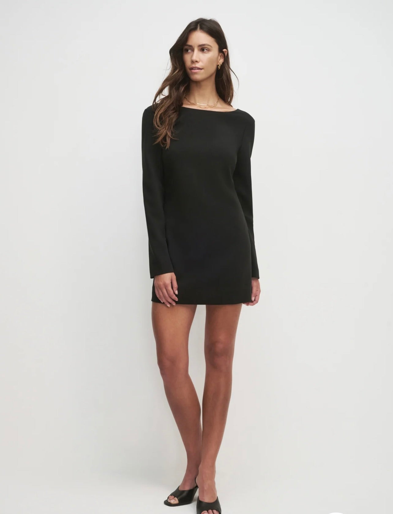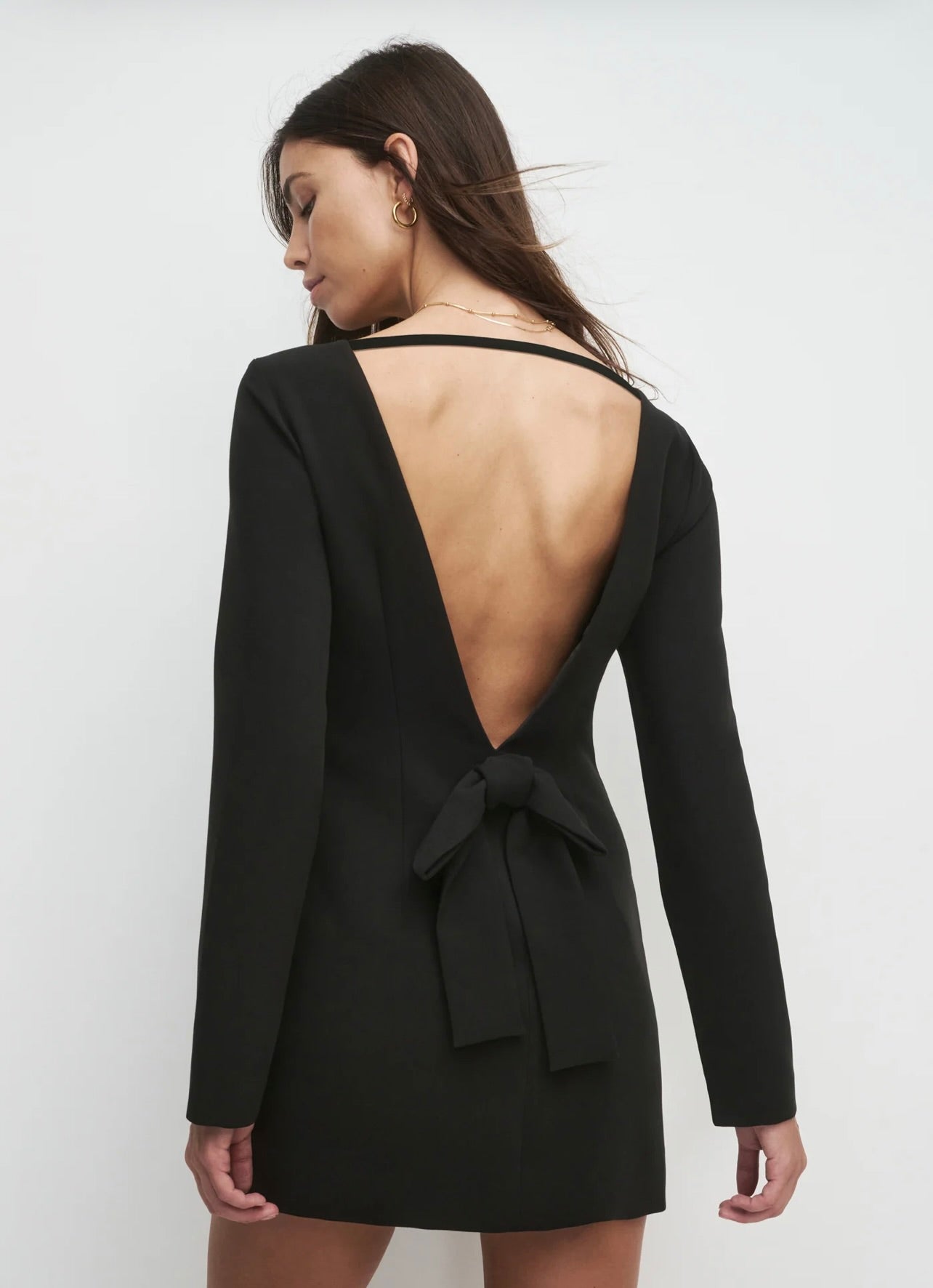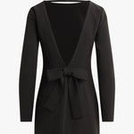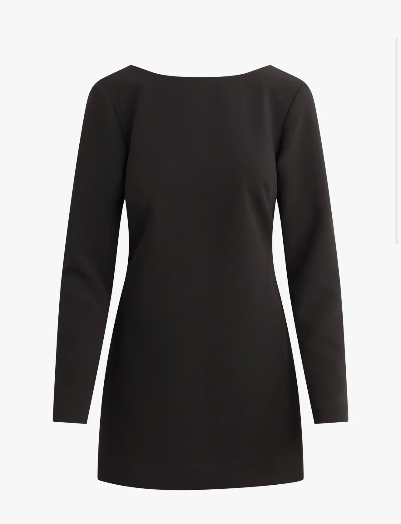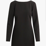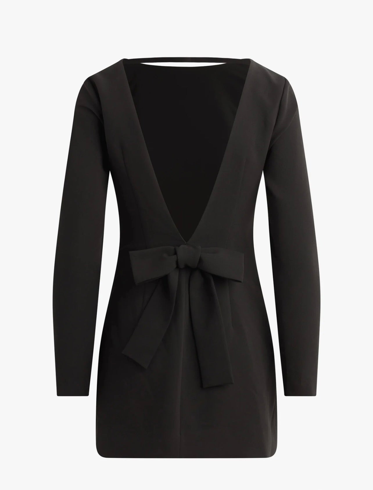 The Meet Cute Dress combines a graceful boat neckline with a deep V-back accented by a soft bow, embodying timeless elegance. Its gently structured A-line silhouette and 32-inch length create a flattering, modern mini that is both refined and effortlessly charming—perfect for making a lasting impression.