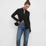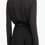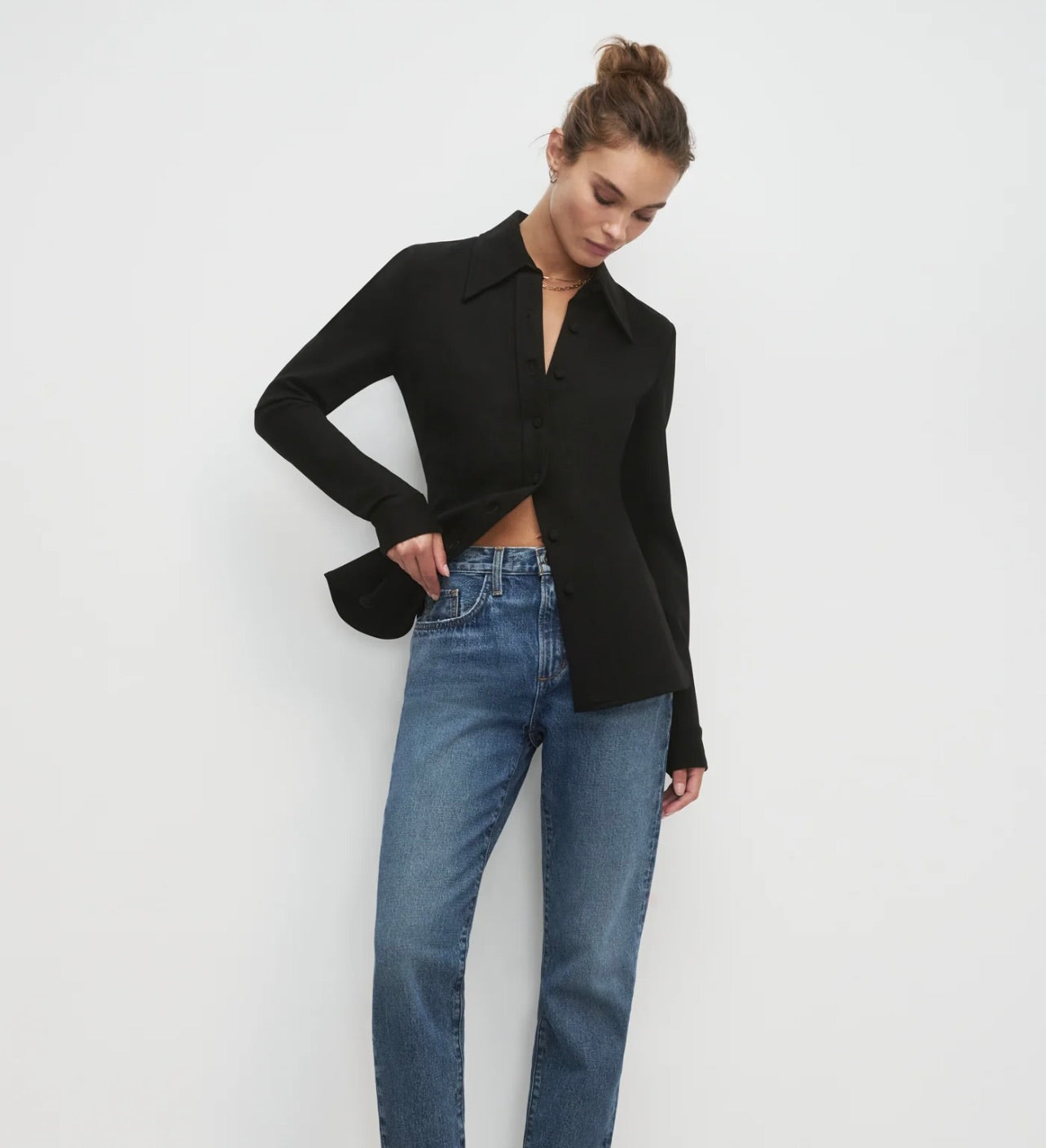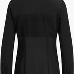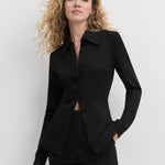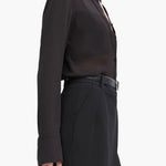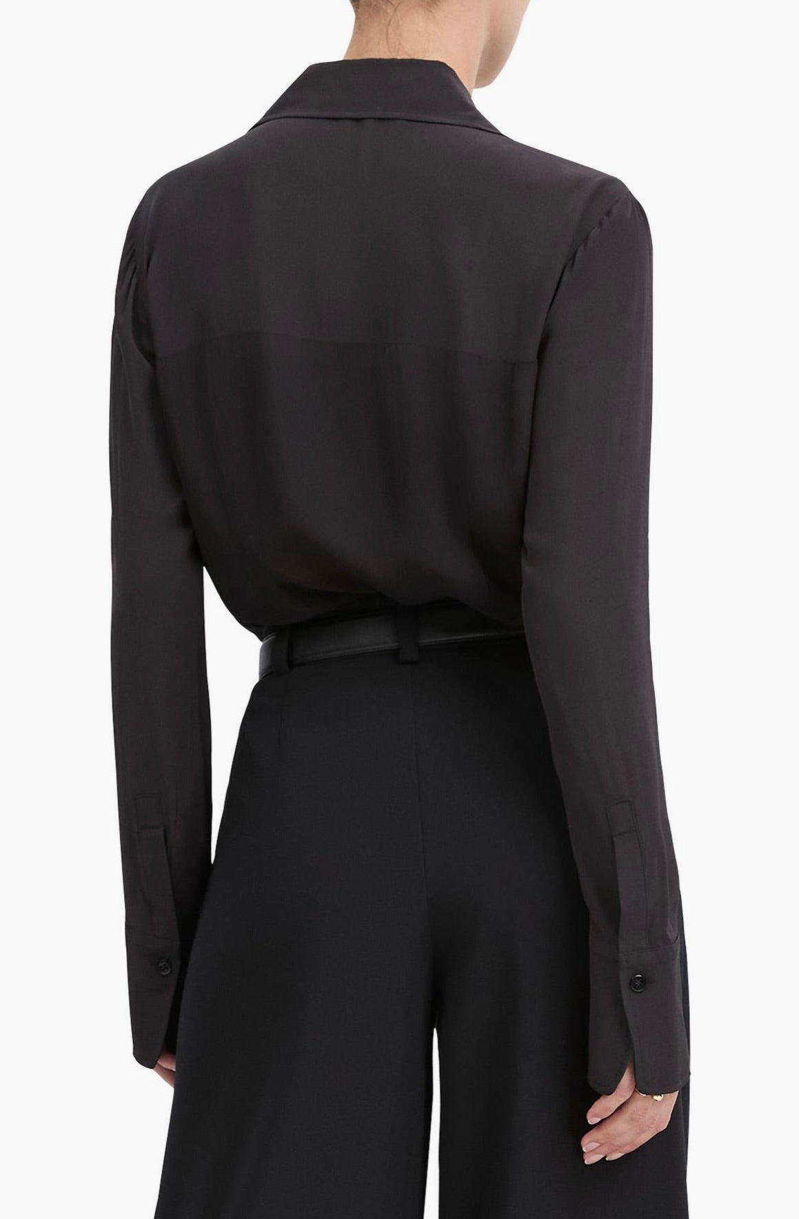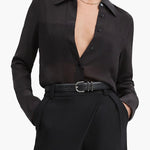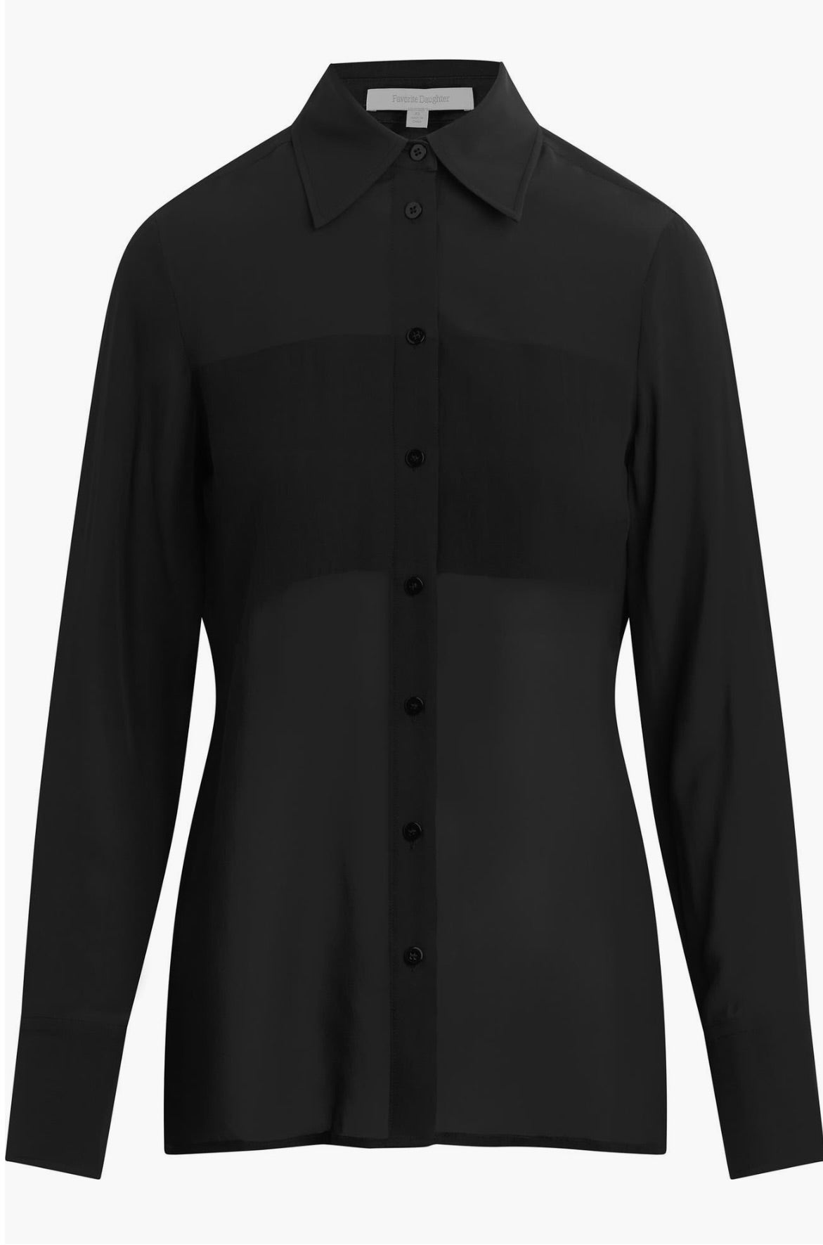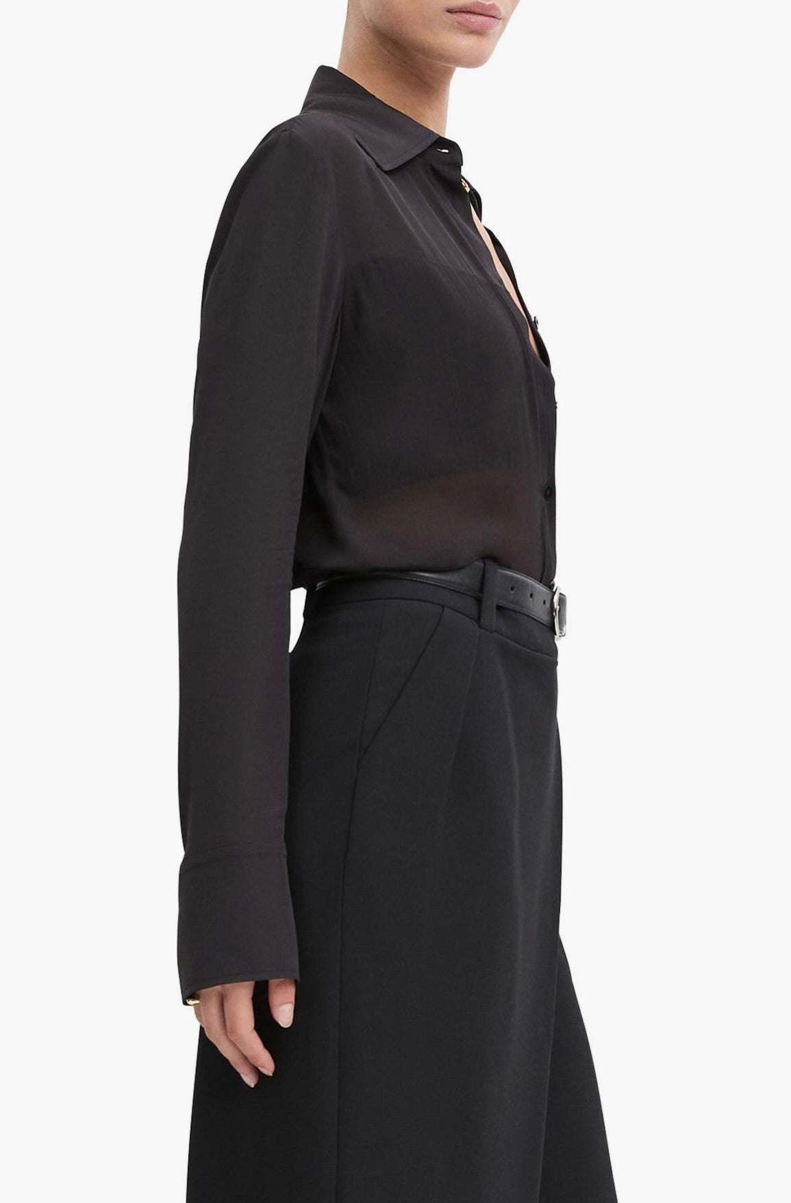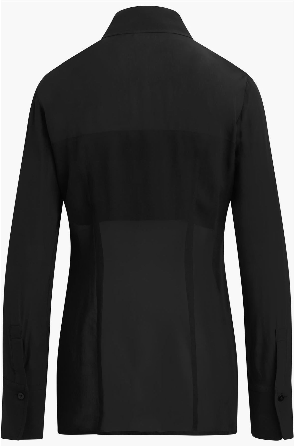 Delicately balanced between understated elegance and modern allure, this collared button-up combines an opaque viscose bodice with sheer sleeves for an effortlessly refined aesthetic. A thoughtful design detail that elevates the timeless button-down into something distinctly sophisticated.
