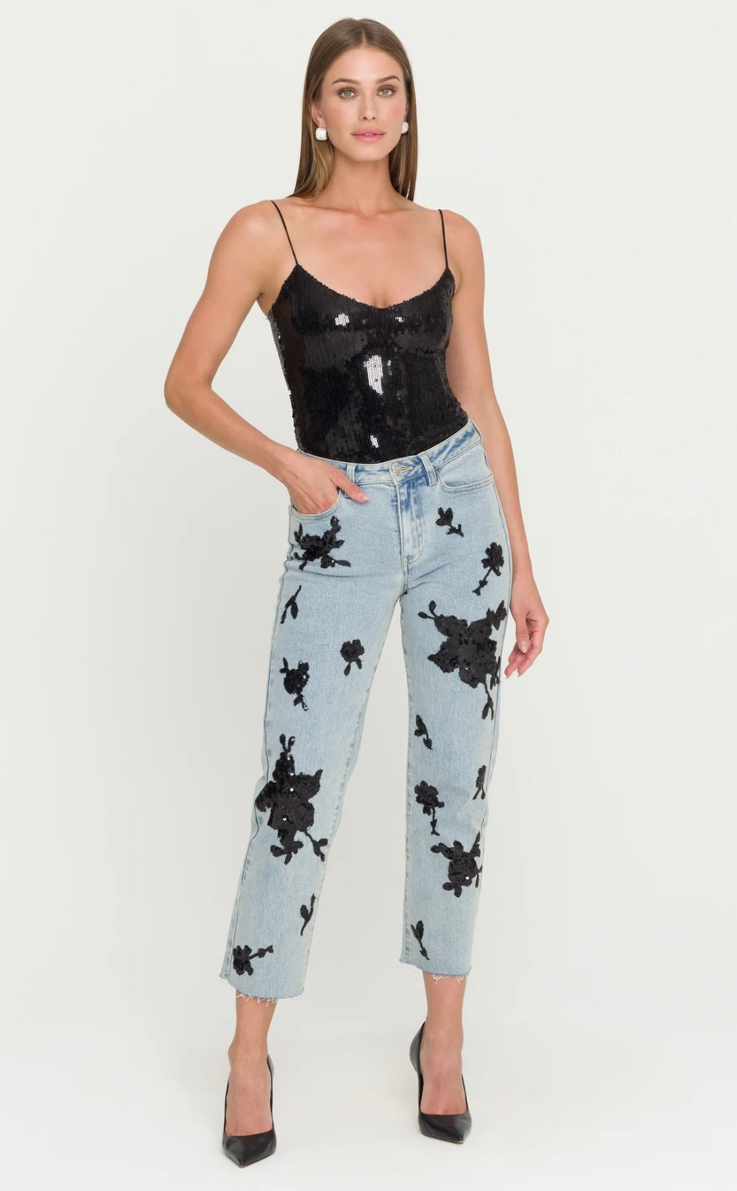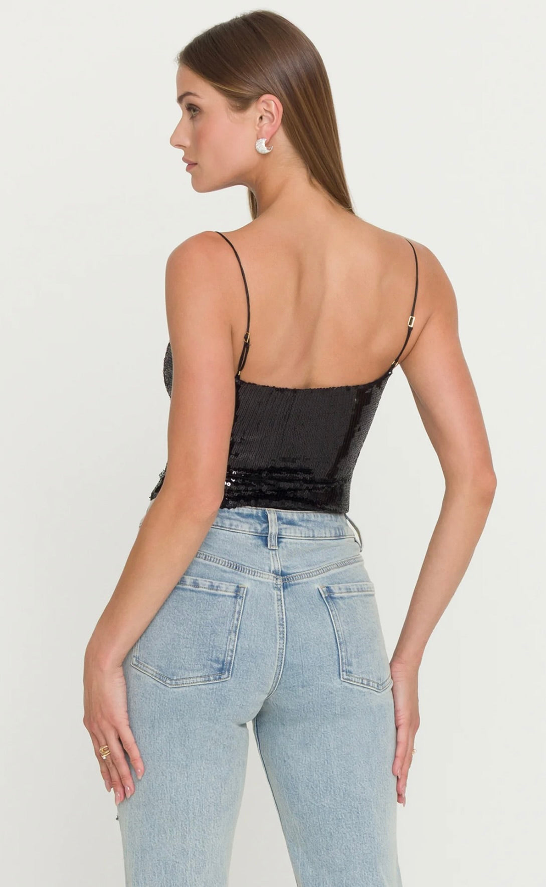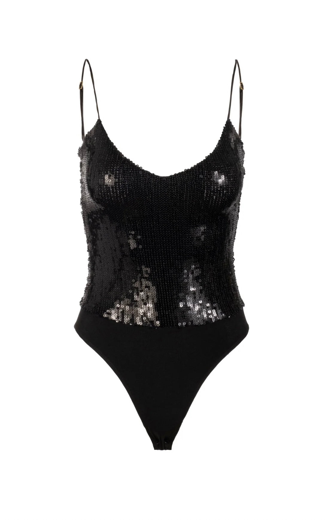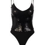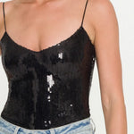 The Sarah Sequin Bodysuit is a statement base layer designed for those who embrace bold glamour. Crafted with a close, body-hugging fit, this sleek one-piece features lustrous black sequins layered over a stretch foundation that moves seamlessly with your body. The high-shine finish transforms any outfit into an evening-ready ensemble. Style it with wide-leg satin trousers for refined elegance or pair with a vegan leather mini skirt for an edgy, sophisticated look.