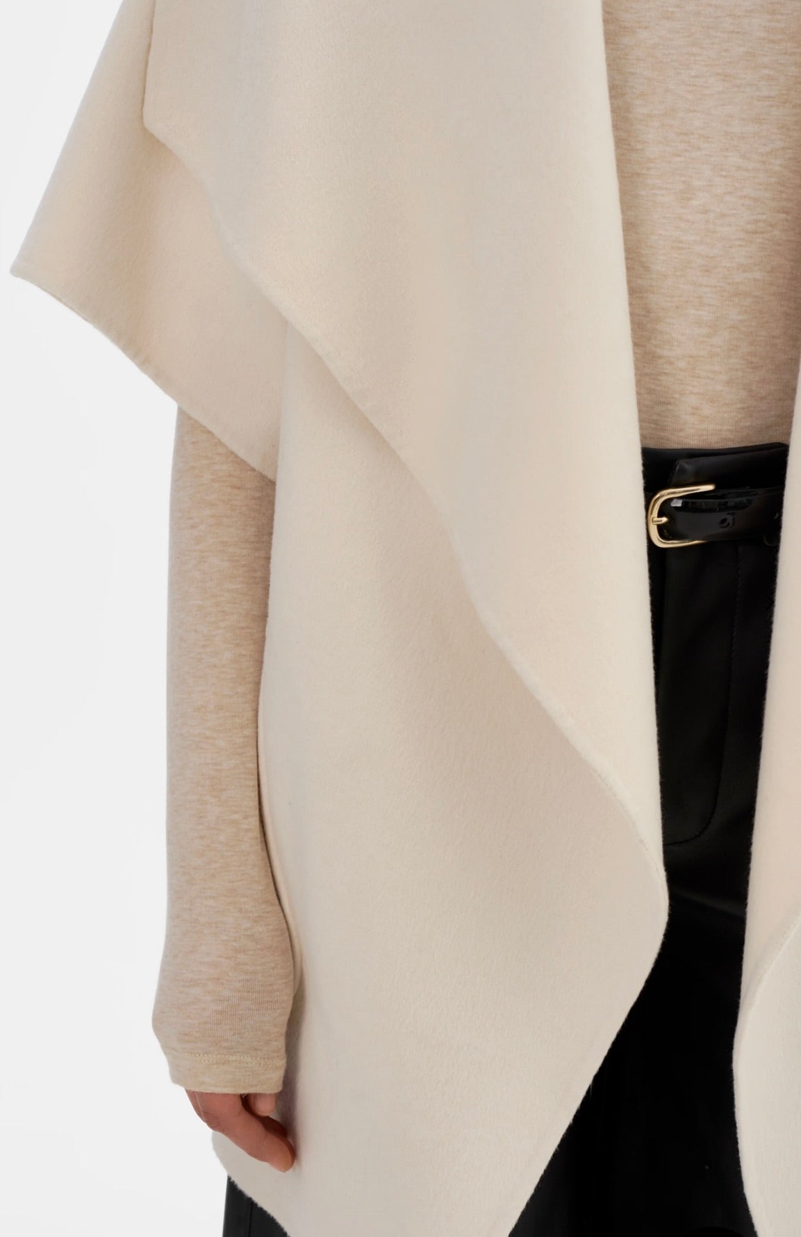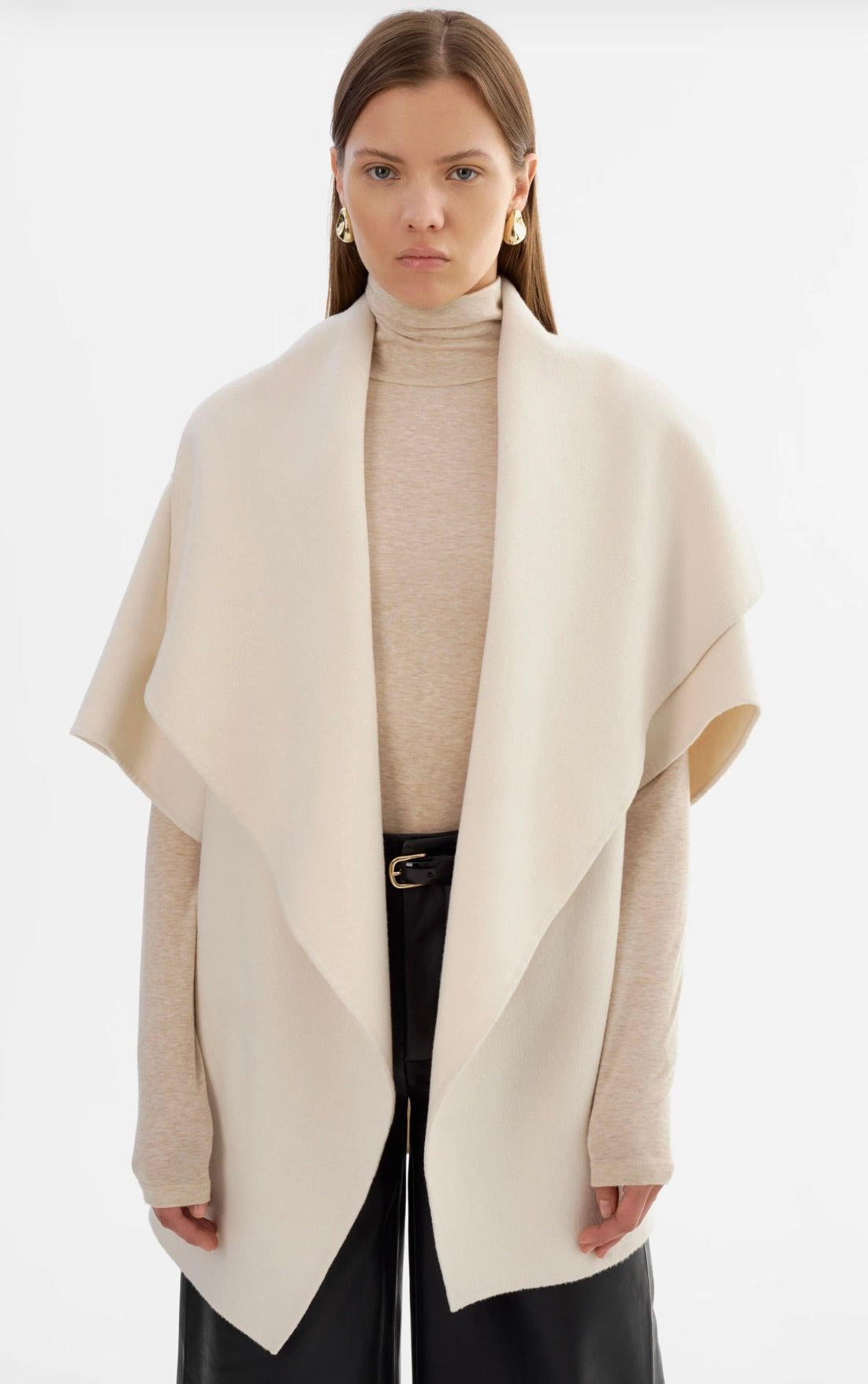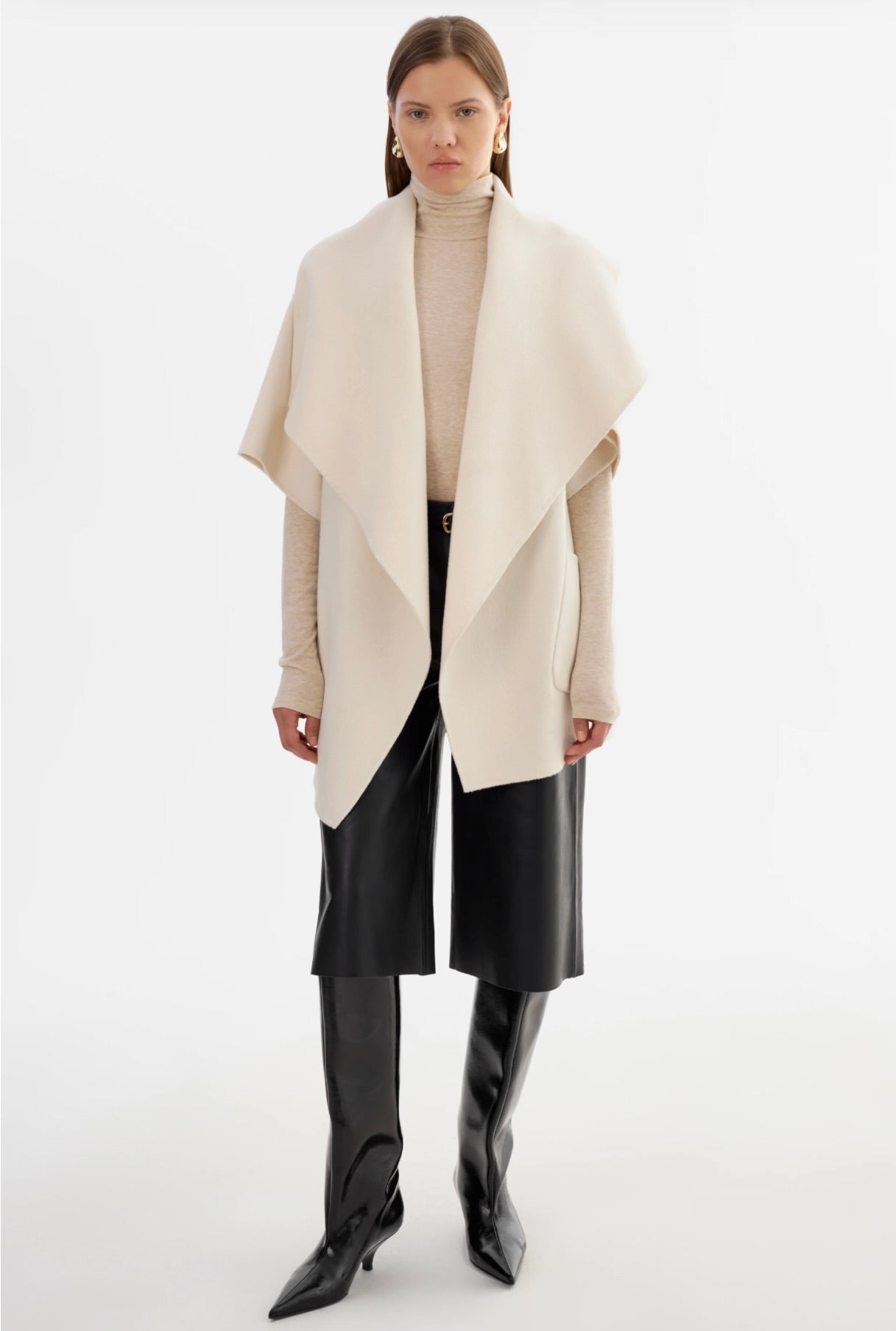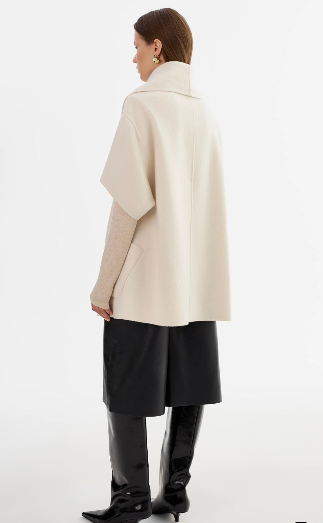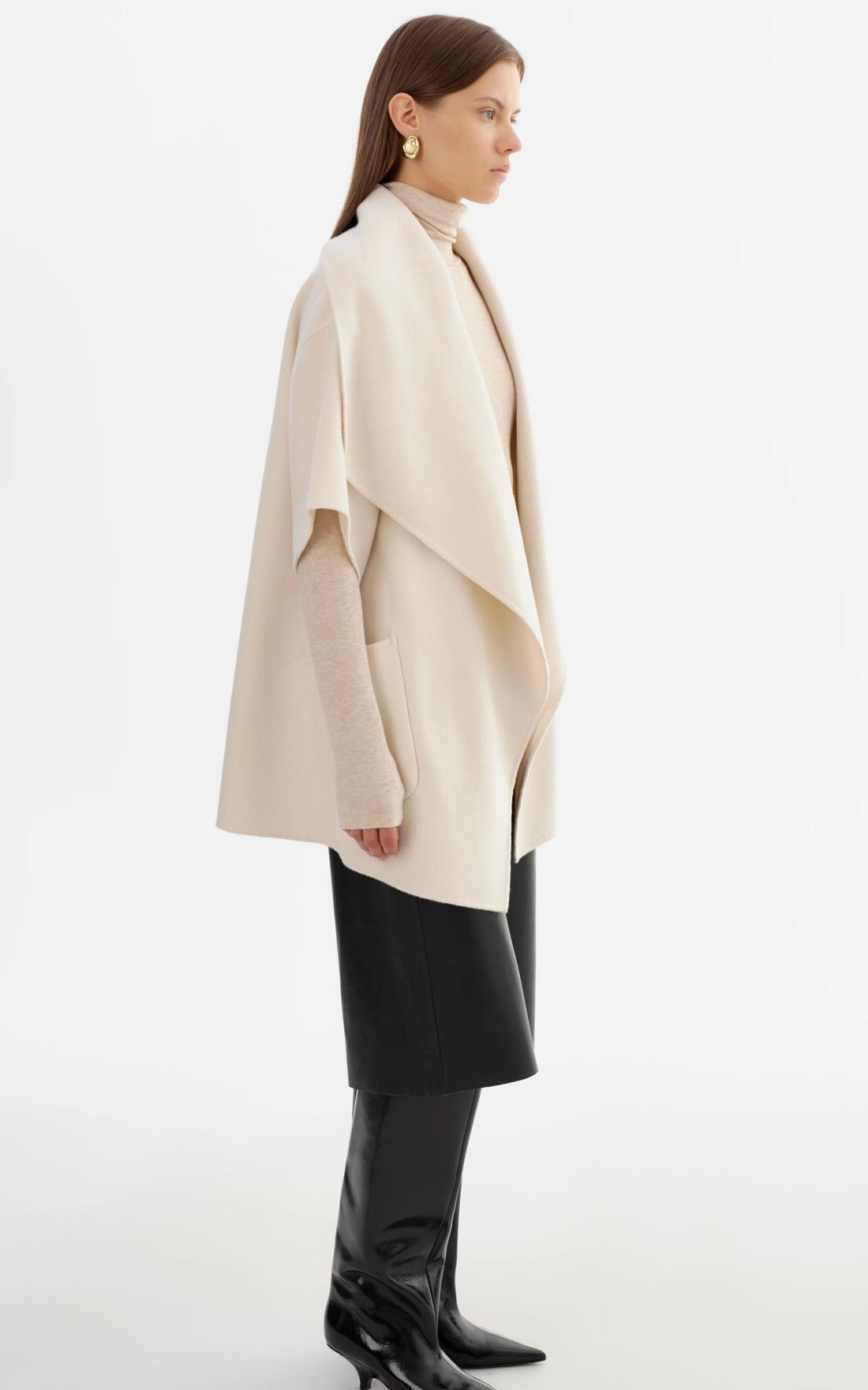 Layer with intention in the LAMARQUE Penelope Double Face Wool Coat. Crafted from luxurious wool, this statement piece features a graceful cascading drape front and functional front patch pockets for effortless sophistication. The oversized silhouette and ¾ sleeves create the perfect canvas for styling—slip a fitted sweater or blouse underneath to let your layers shine. Timeless construction meets modern design for a polished ensemble that transitions seamlessly from day to evening.