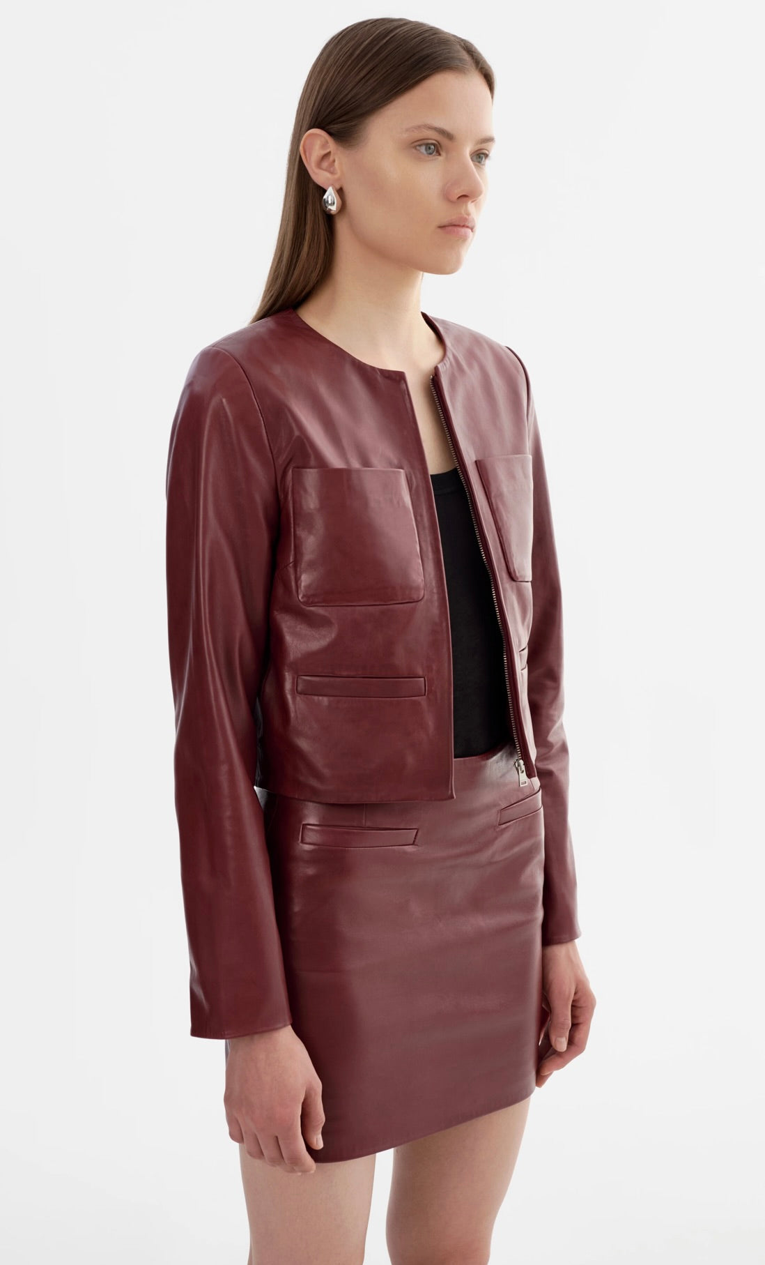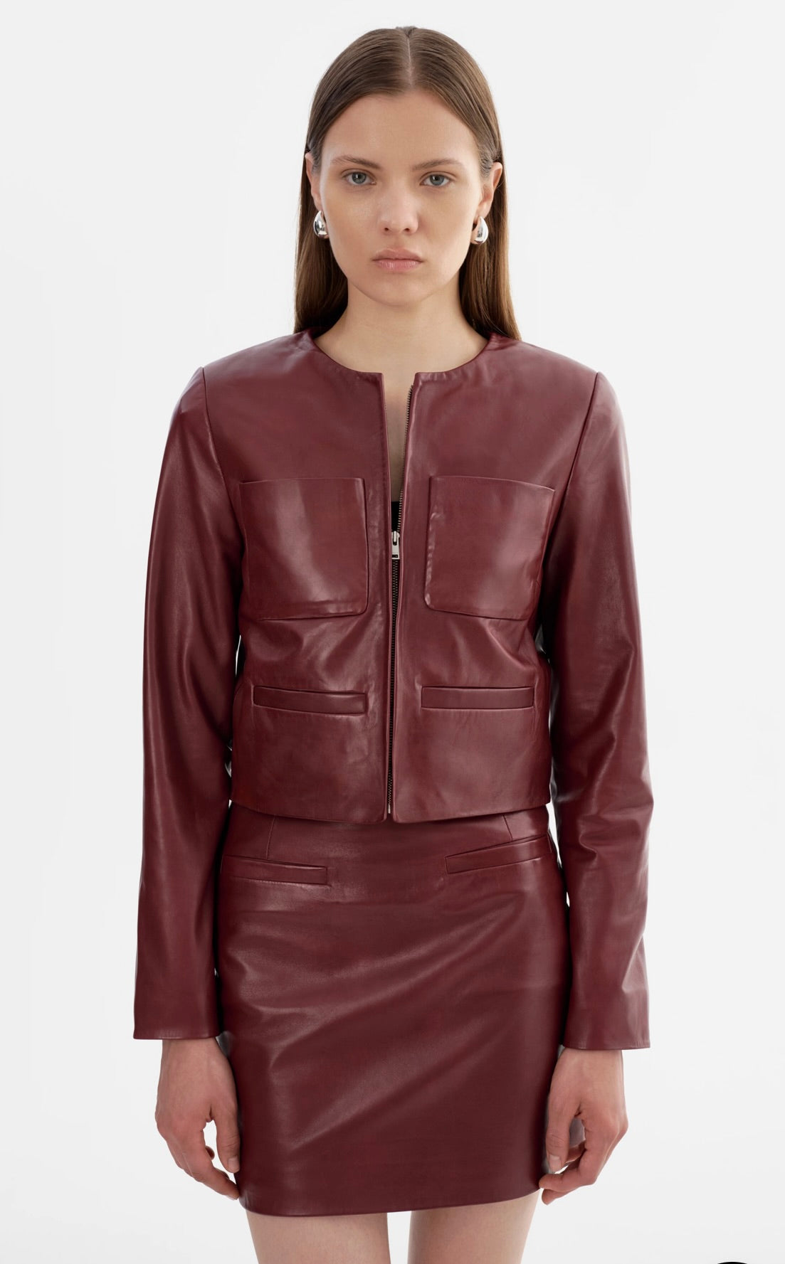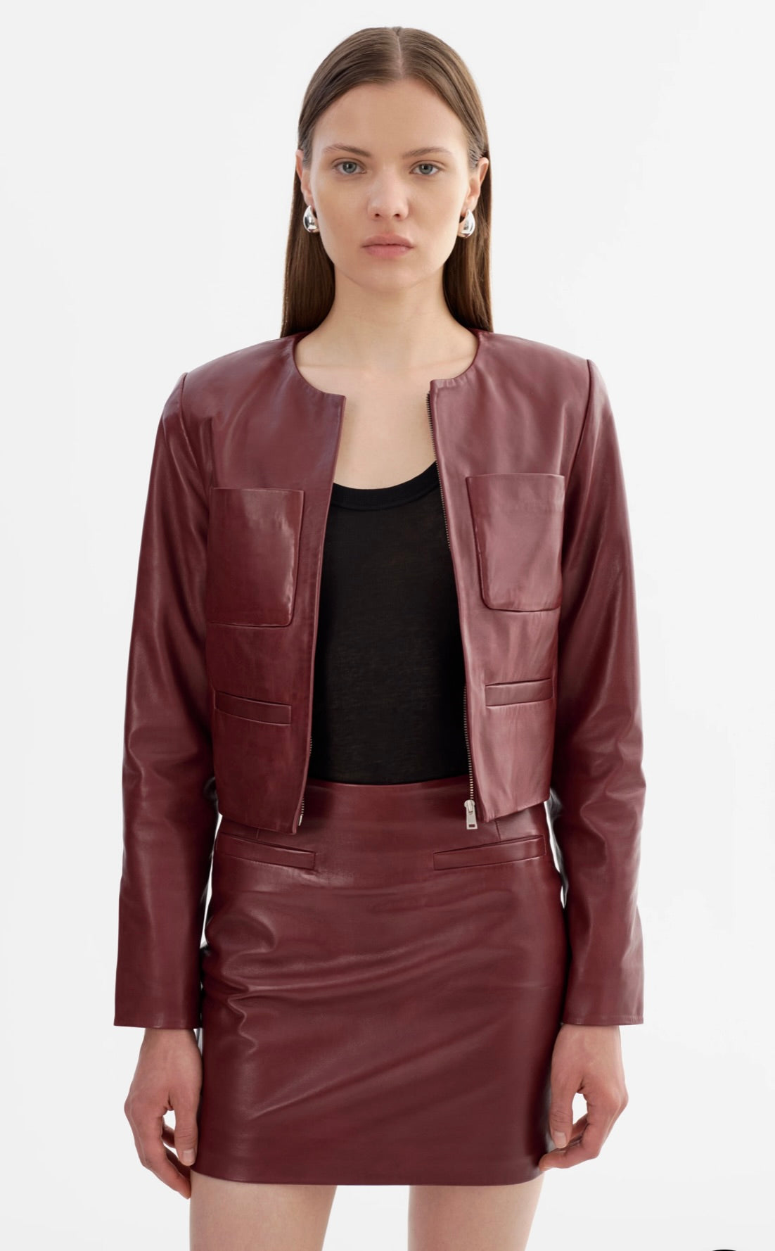 The LINETTE Leather Jacket is a must-have for any timeless wardrobe, showcasing a modern twist on a classic silhouette. Expertly crafted from luxurious lamb leather, this piece boasts a chic round collar, two front patch pockets, and a sleek, minimalist design.