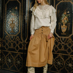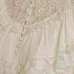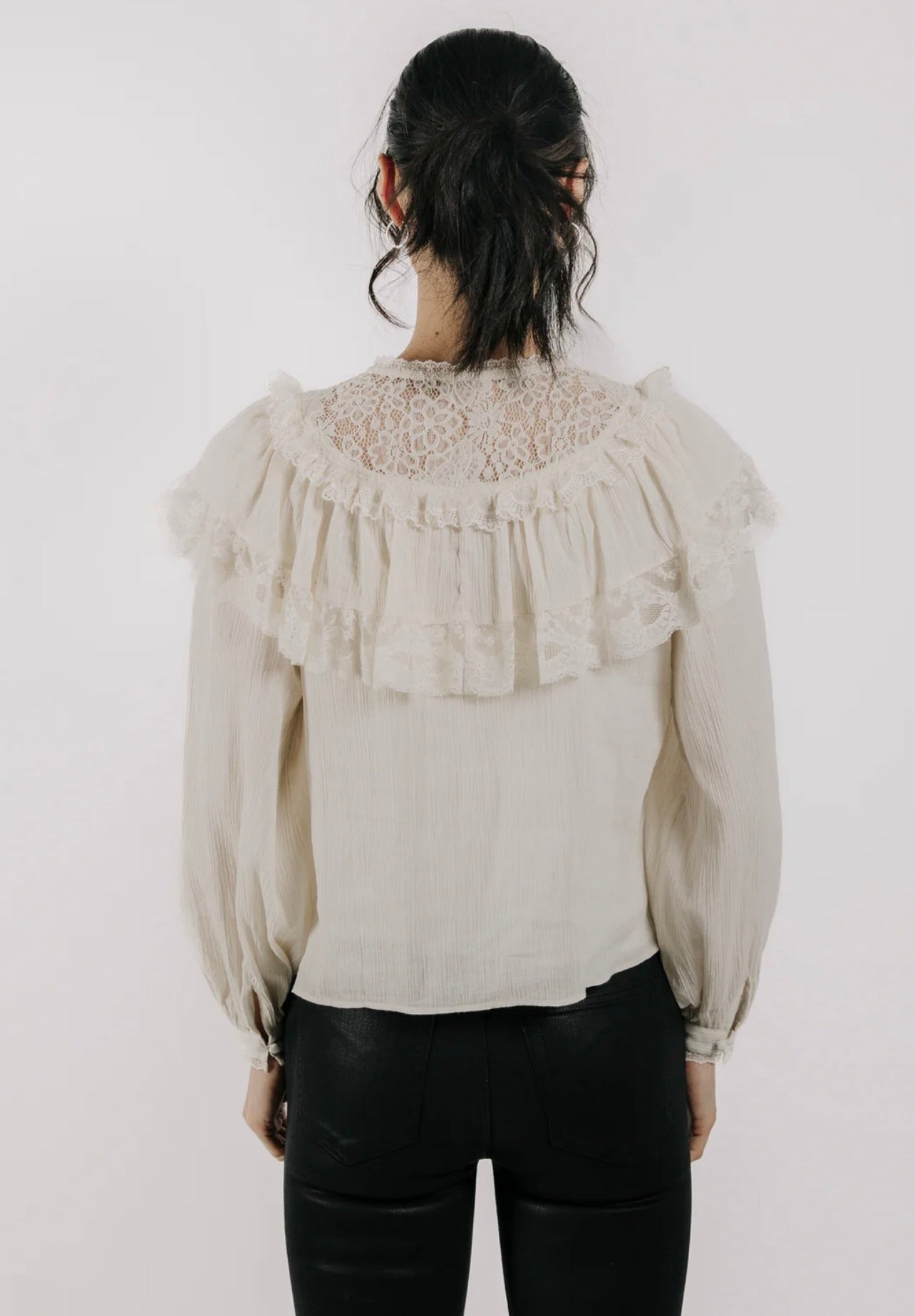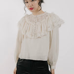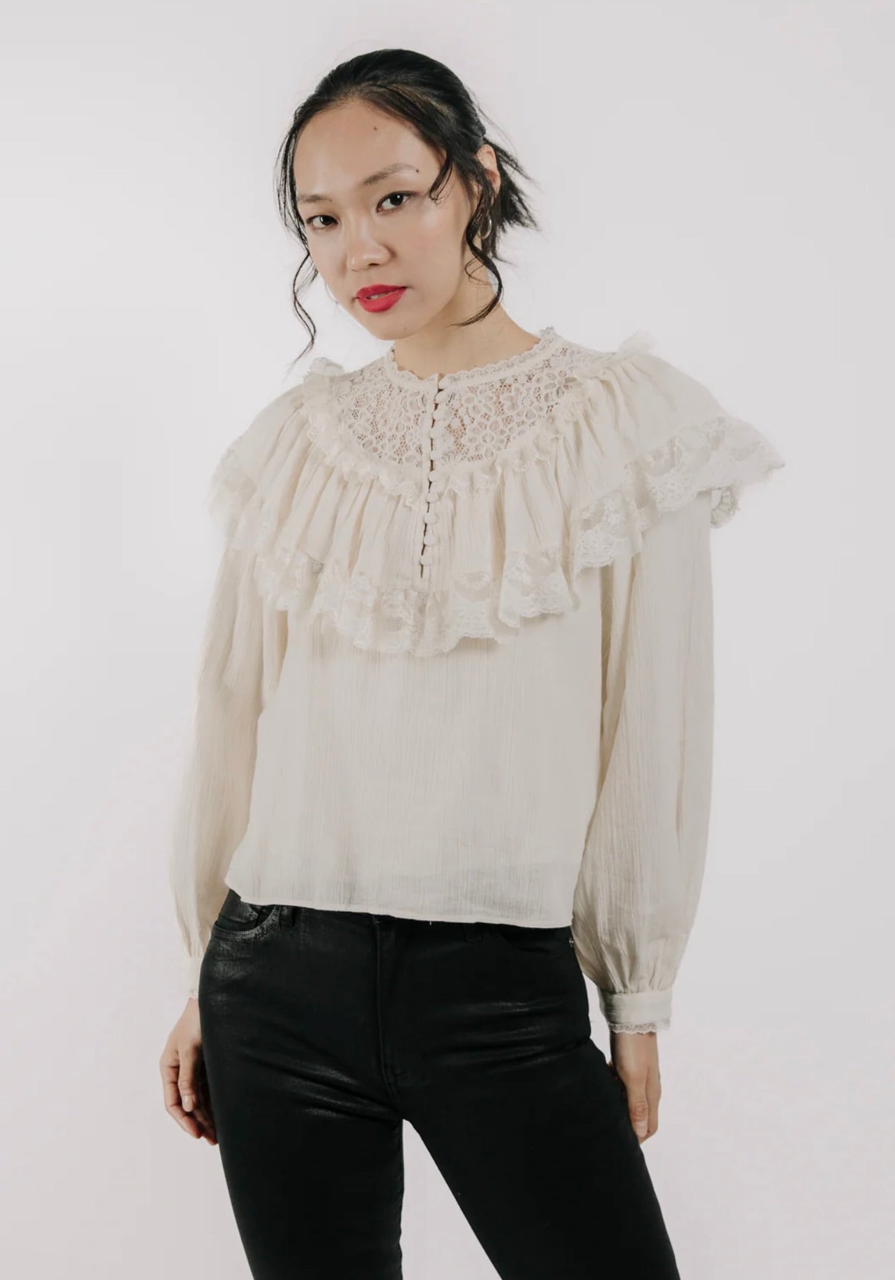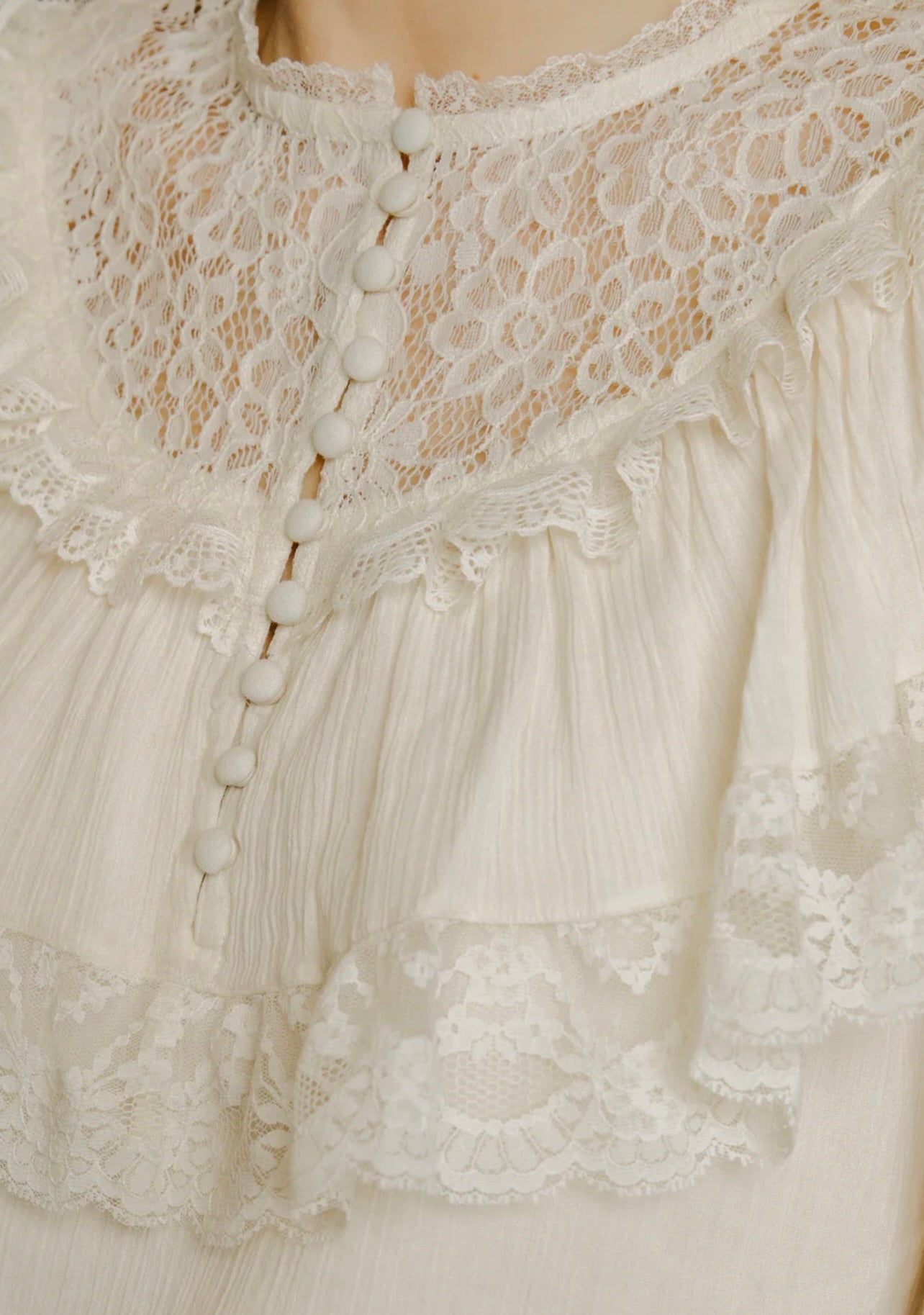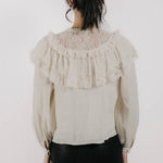 The Brandi Top embodies romance with its flowing lace ruffles and subtle sheer inserts. Adorned with fabric-covered buttons reminiscent of traditional lace craftsmanship, it offers a classic vintage charm to its elegant, feminine design.