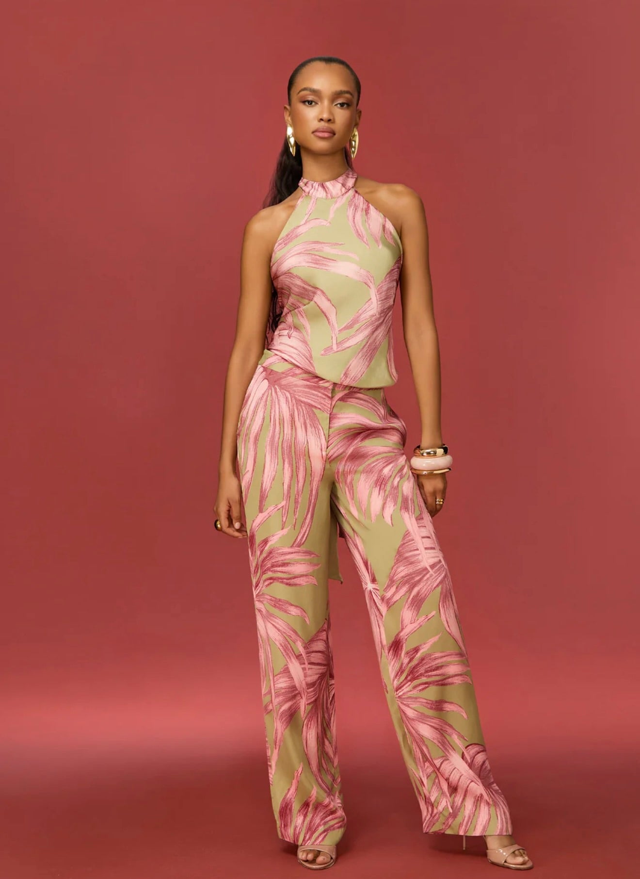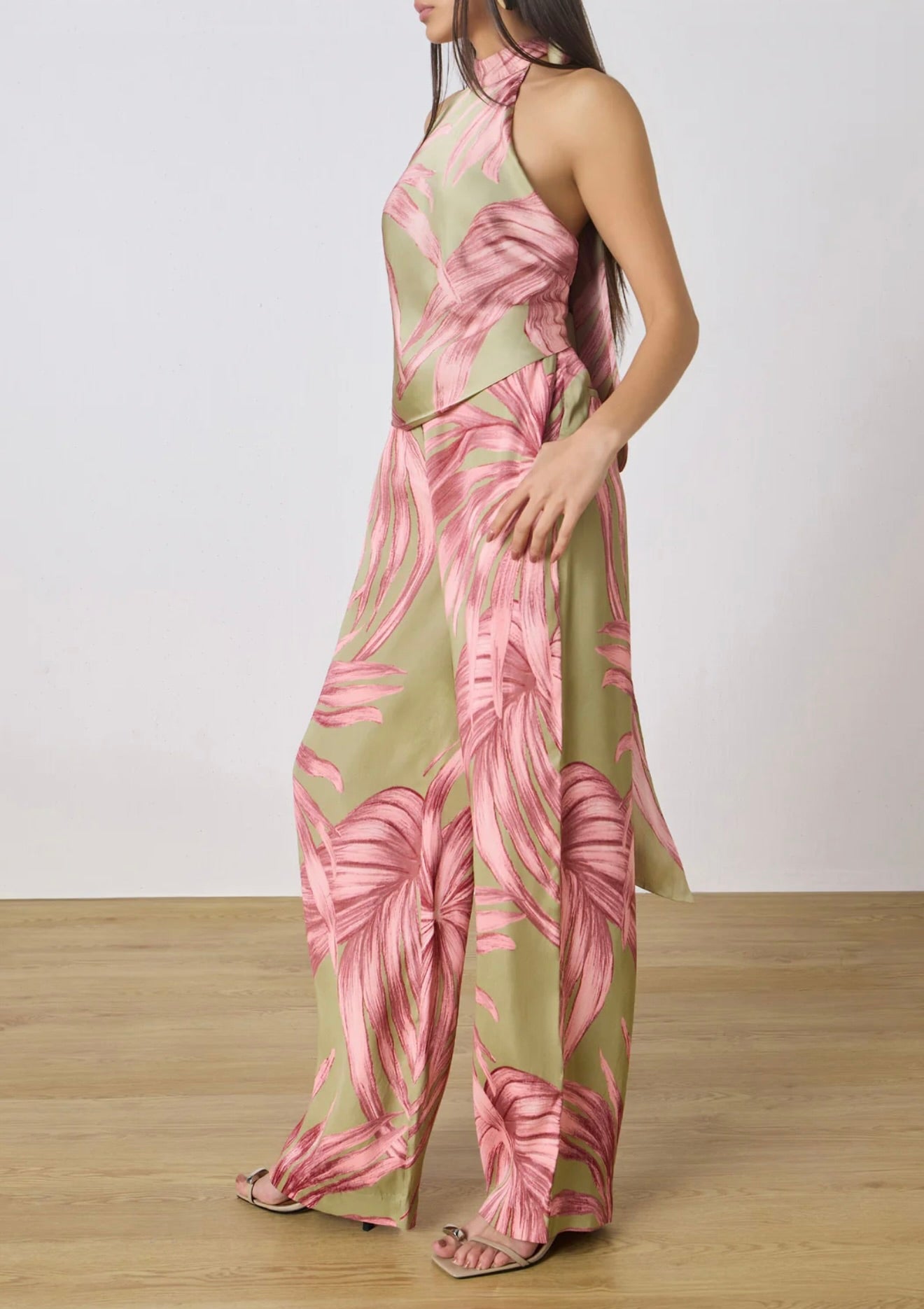 Rendered in lush green viscose adorned with a delicate palm leaf print, these mid-rise pants feature a relaxed straight leg that skims the body without clinging. The thoughtful construction includes a fly and hook closure paired with a smooth lining, creating a polished foundation for any season. Designed for versatility, these pants move fluidly from travel days to city adventures to laid-back gatherings. The soft drape and organic palm leaf pattern bring an understated elegance that pairs beautifully with the Fawn Halter Top for a complete, cohesive look.
