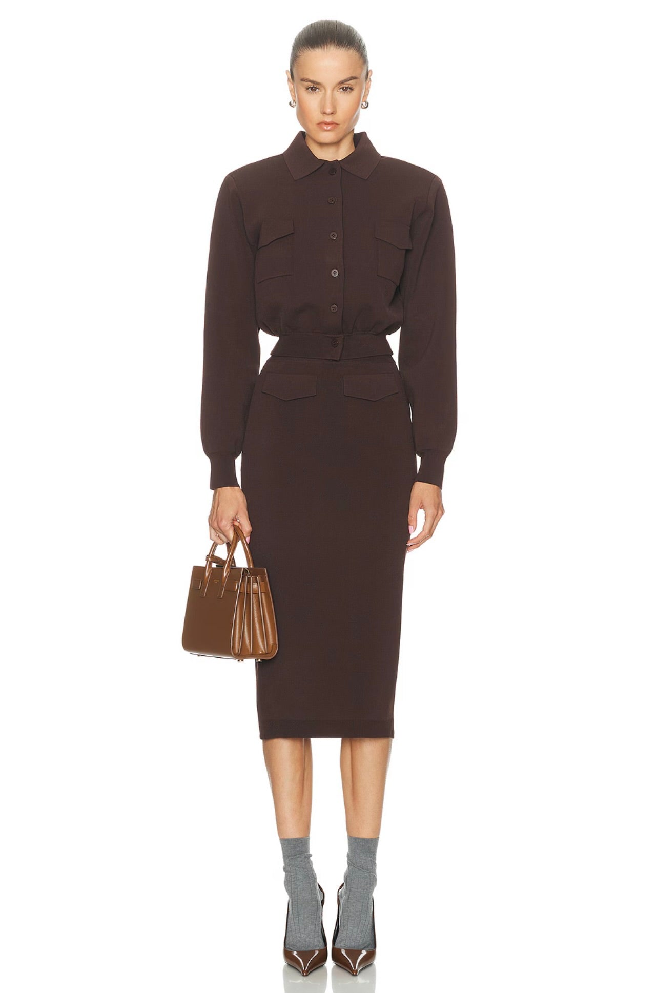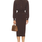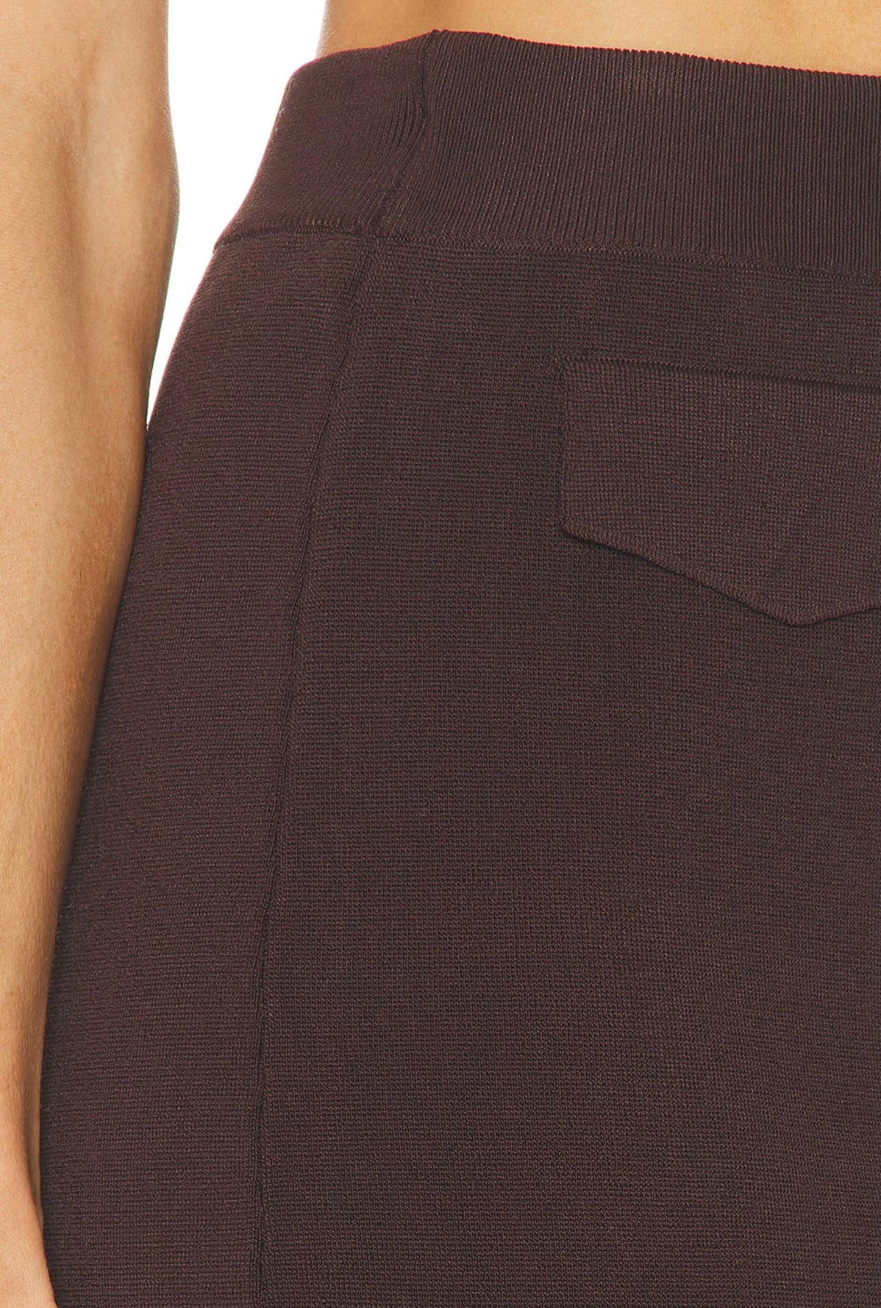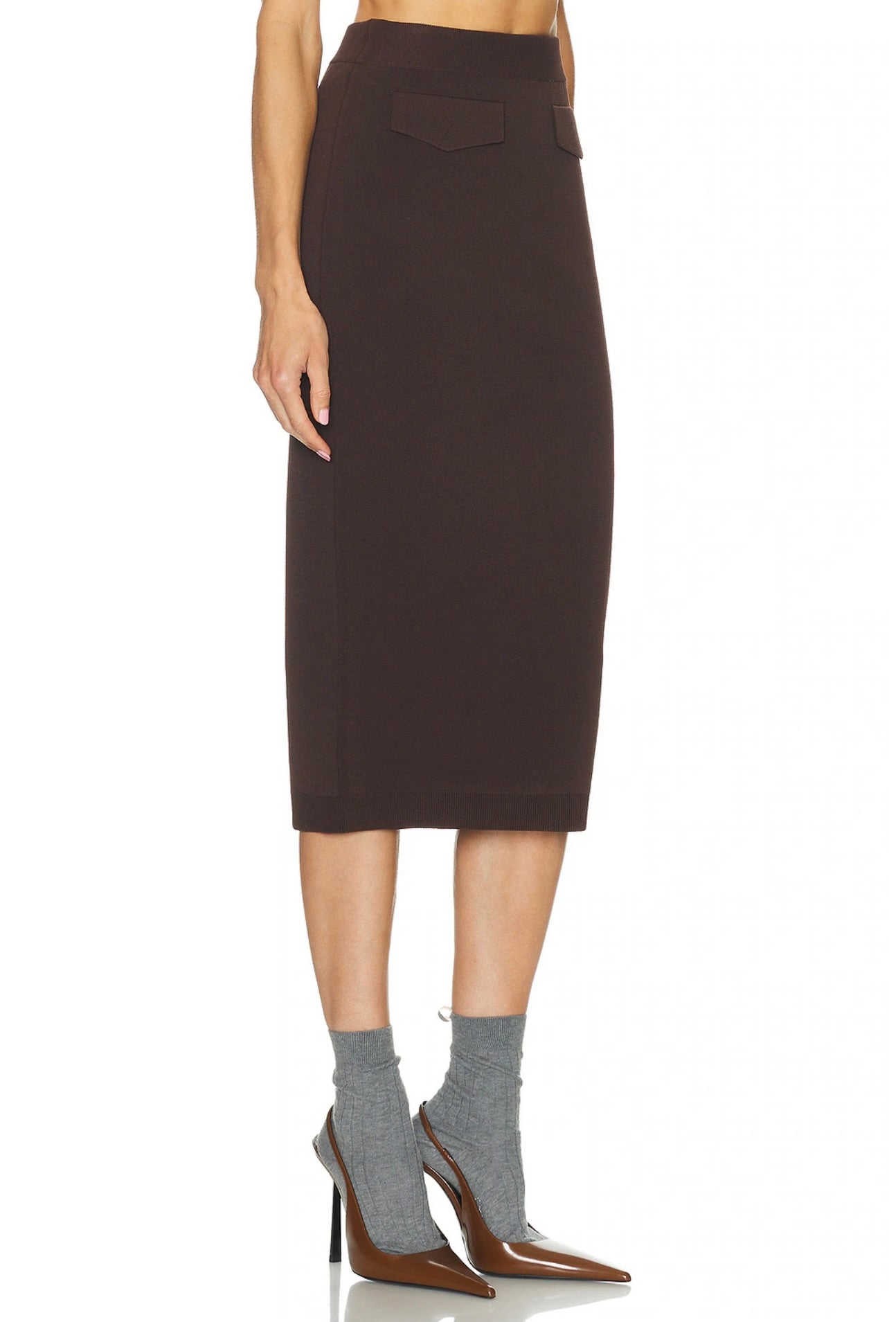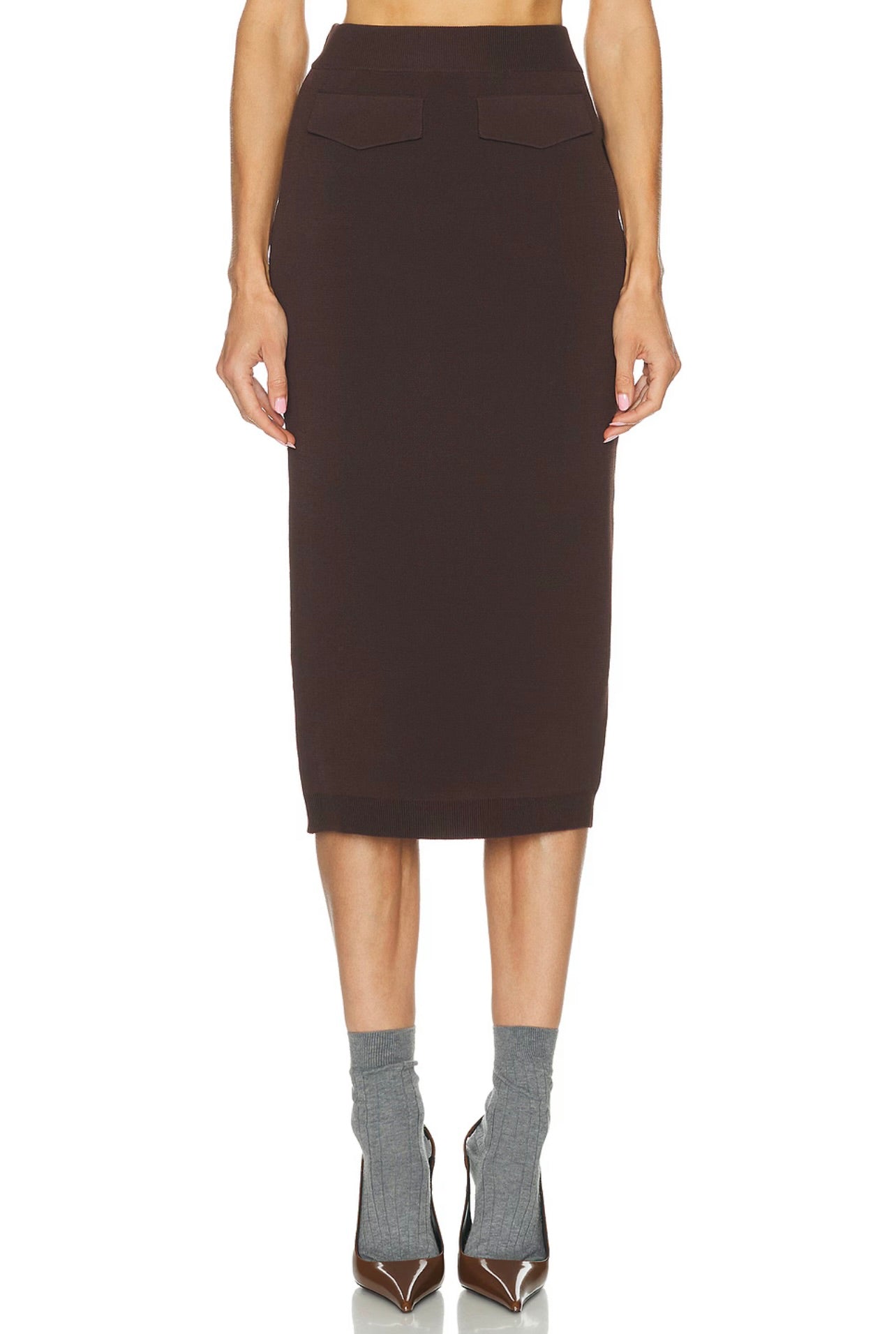 The SEROYA Opal Midi Skirt features a mid-rise fit and elegant knit fabric, accented with flap pocket details at the front. Its refined silhouette offers both comfort and style, making it a versatile piece for sophisticated looks. Pair it seamlessly with the Ophelia Sweater to complete an effortlessly chic ensemble.