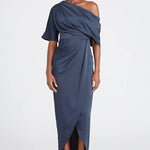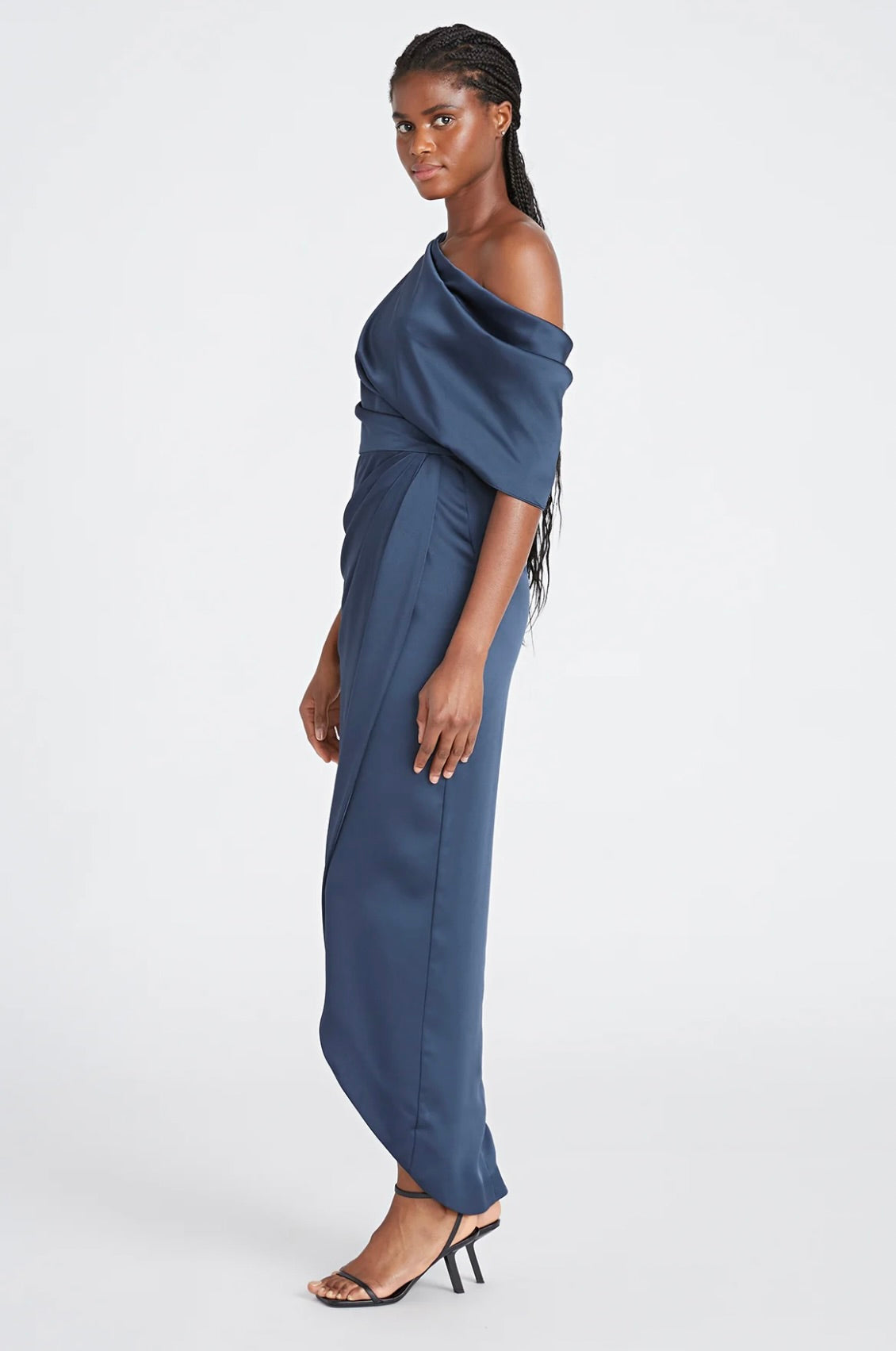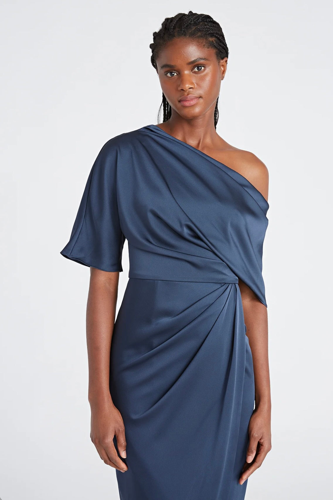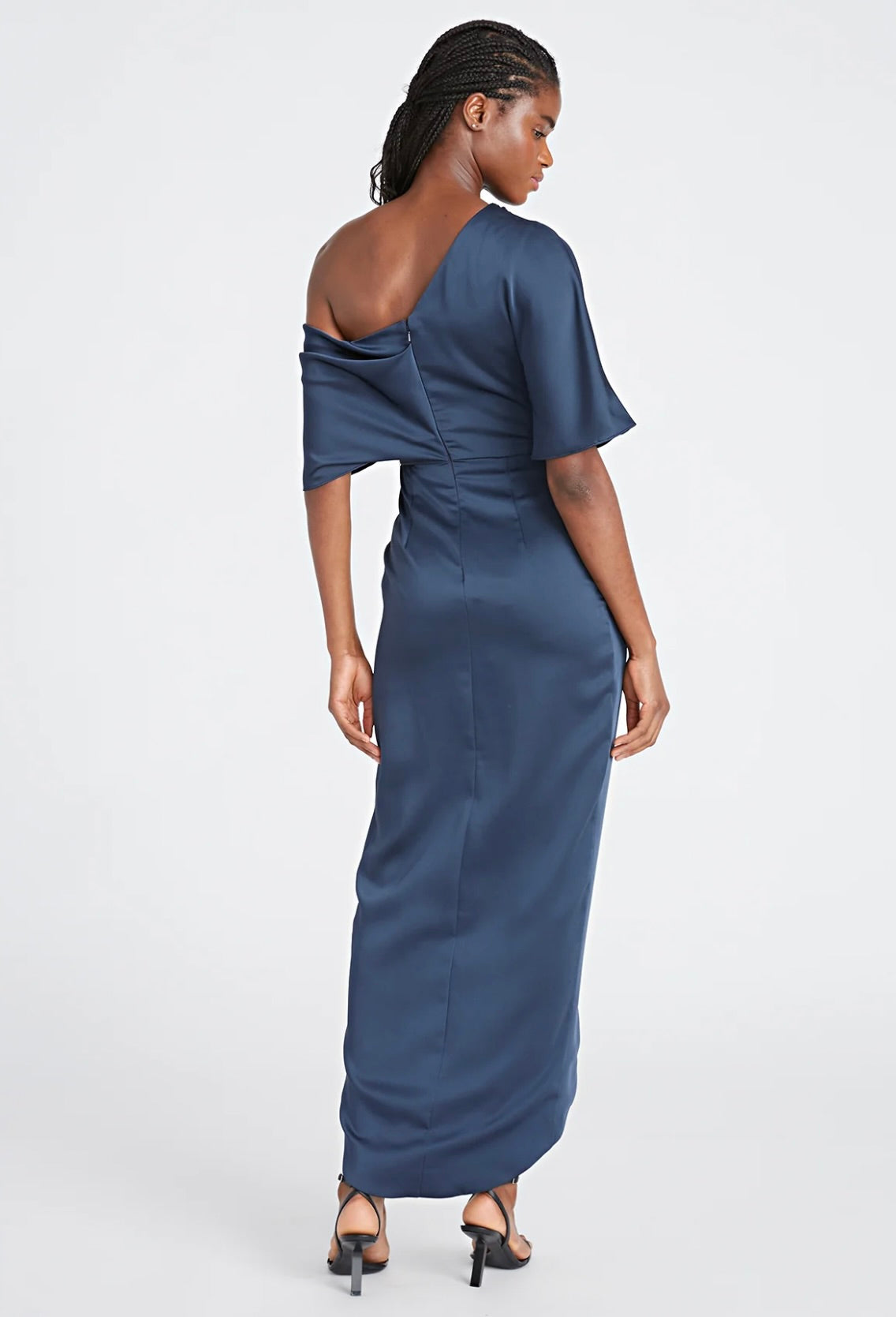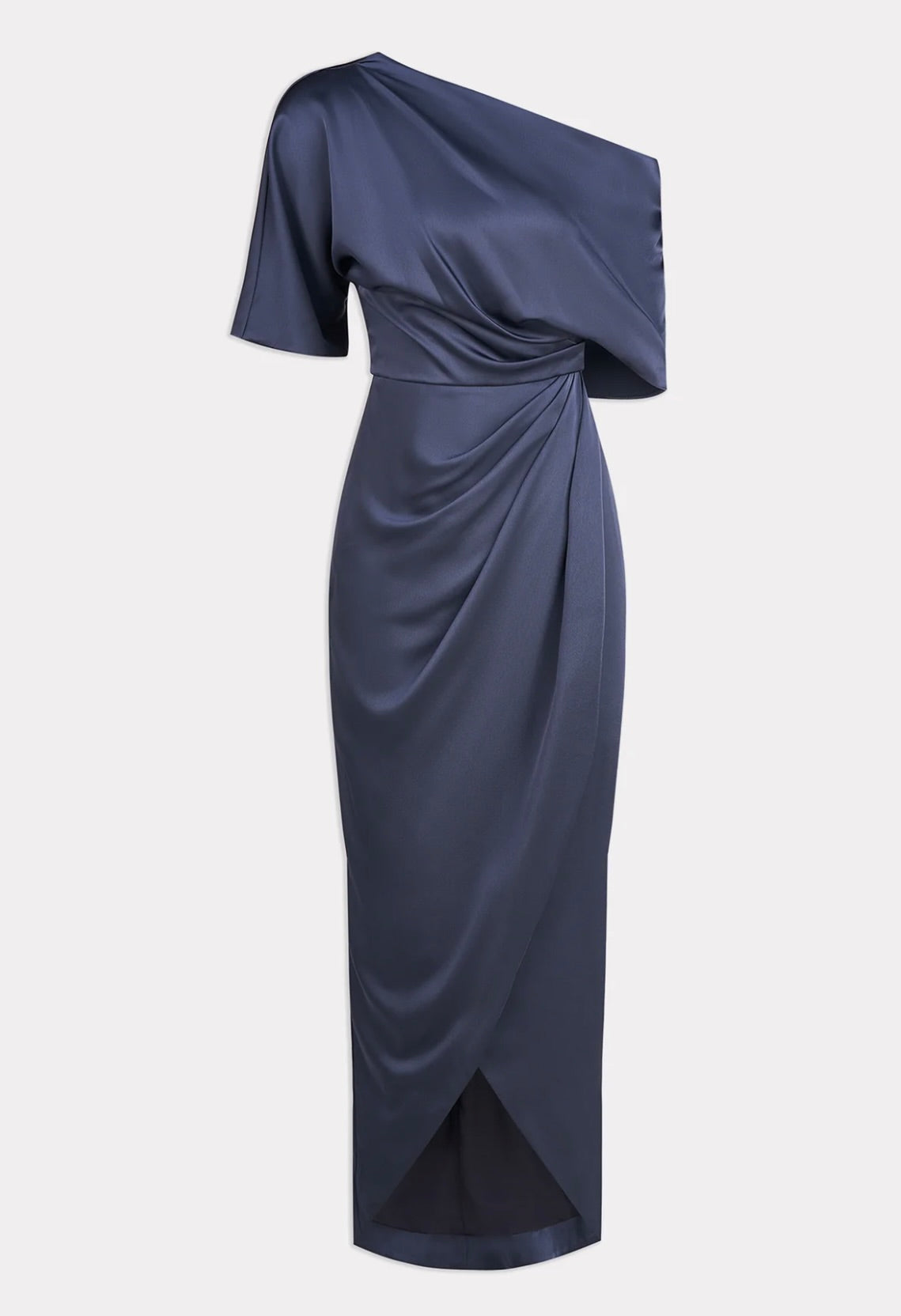 Crafted in luxurious satin, the Theia Rayna One Shoulder Draped Gown showcases an asymmetrical silhouette that balances architectural precision with fluid elegance. The signature single sleeve and wrap-style skirt create a dynamic sense of movement, while the gown's streamlined proportions maintain an air of refined restraint. Perfect for formal occasions and upscale events, this piece combines modern design sensibilities with timeless sophistication.