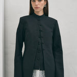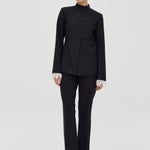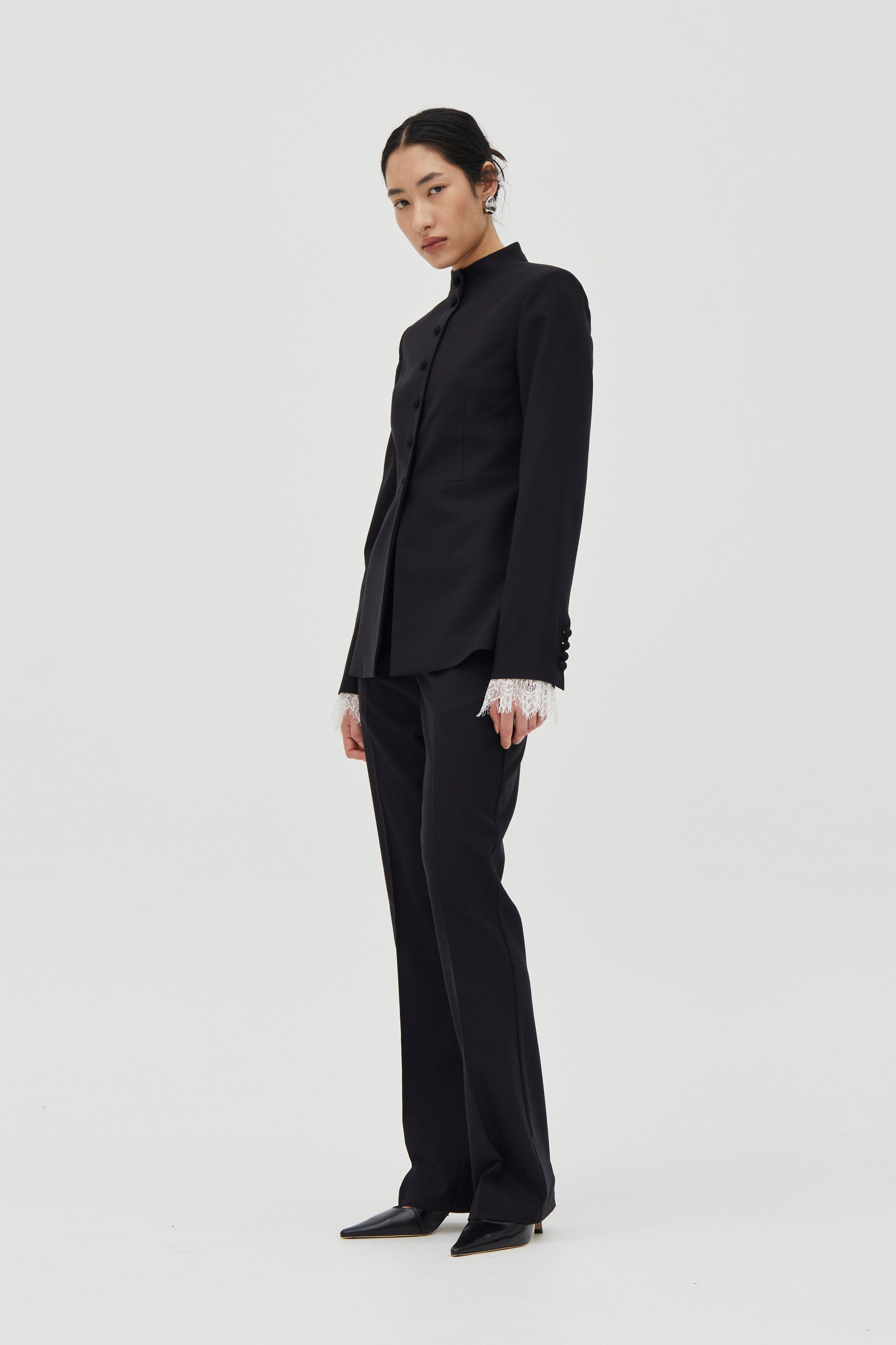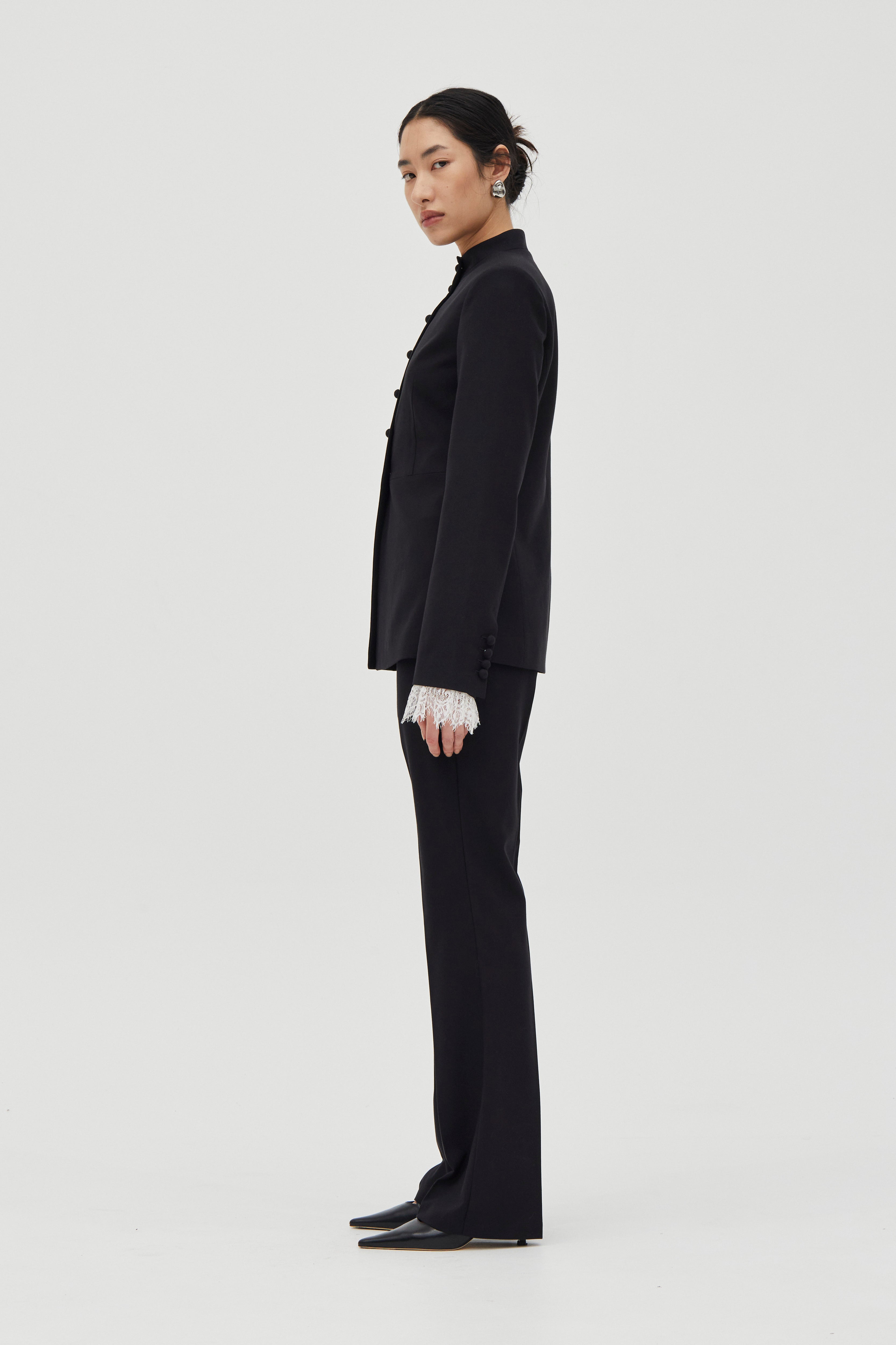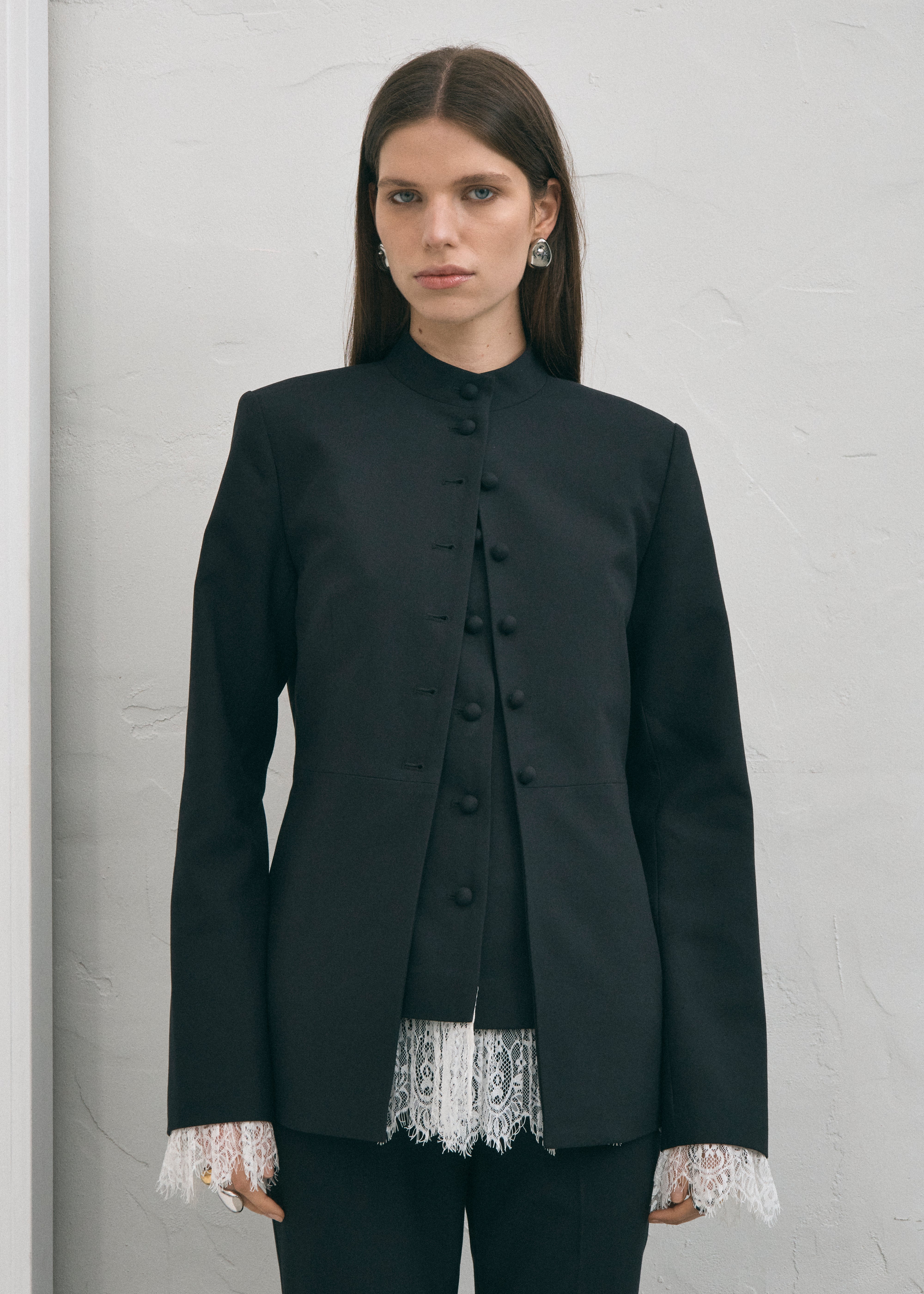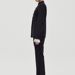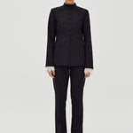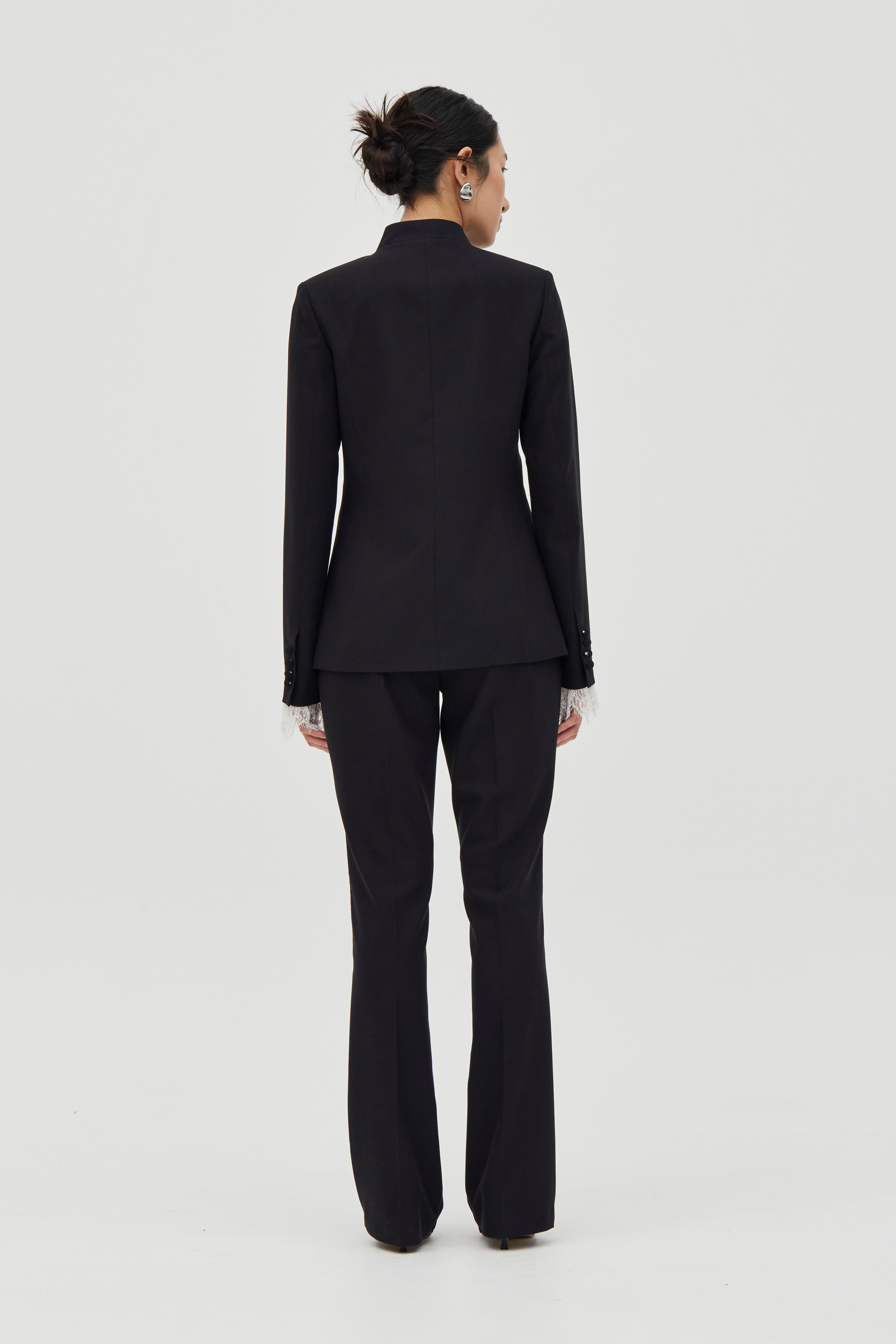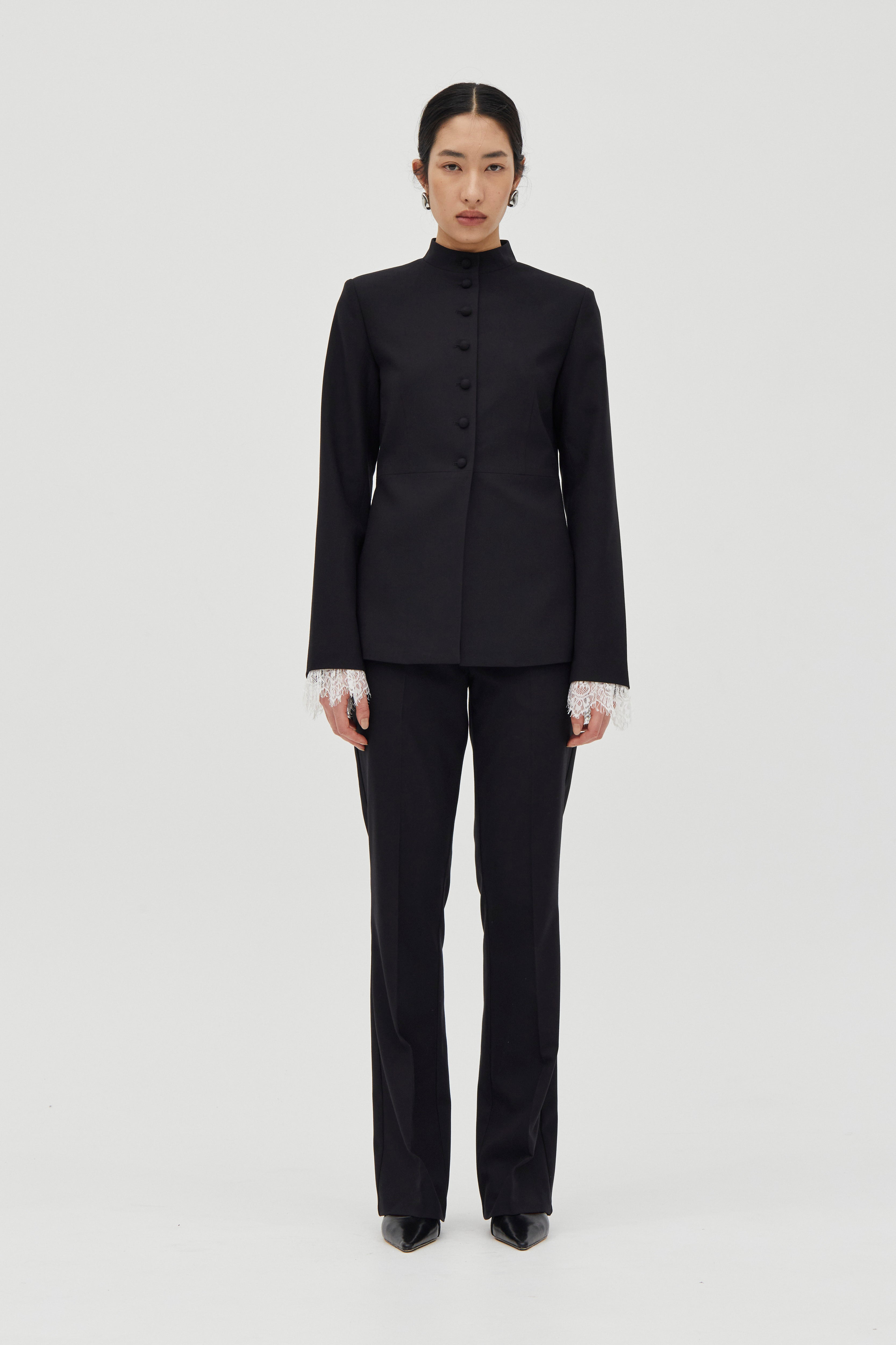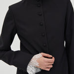 This sophisticated blazer reimagines classic tailoring with modern sensibility. The sharp sergeant collar and sculpted bodice create a polished silhouette, anchored by self-covered buttons down the center front. Intricate pleated lace trims the cuffs, add a refined detail that softens the structured frame. A versatile layer that transitions effortlessly from boardroom to evening, the Nocturne Lace Trim Blazer proves that timeless style lies in the precision of its construction.