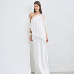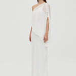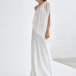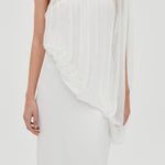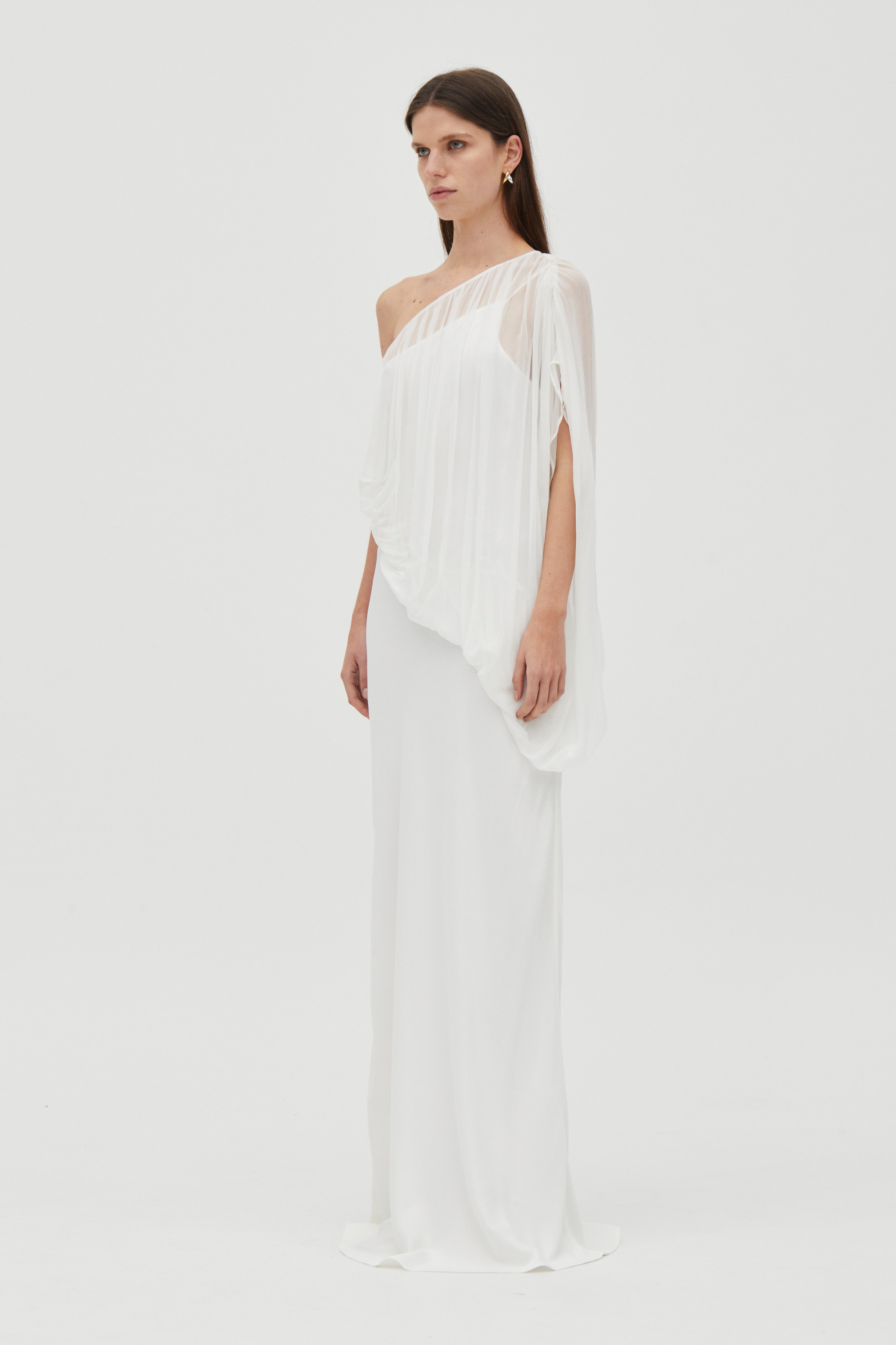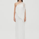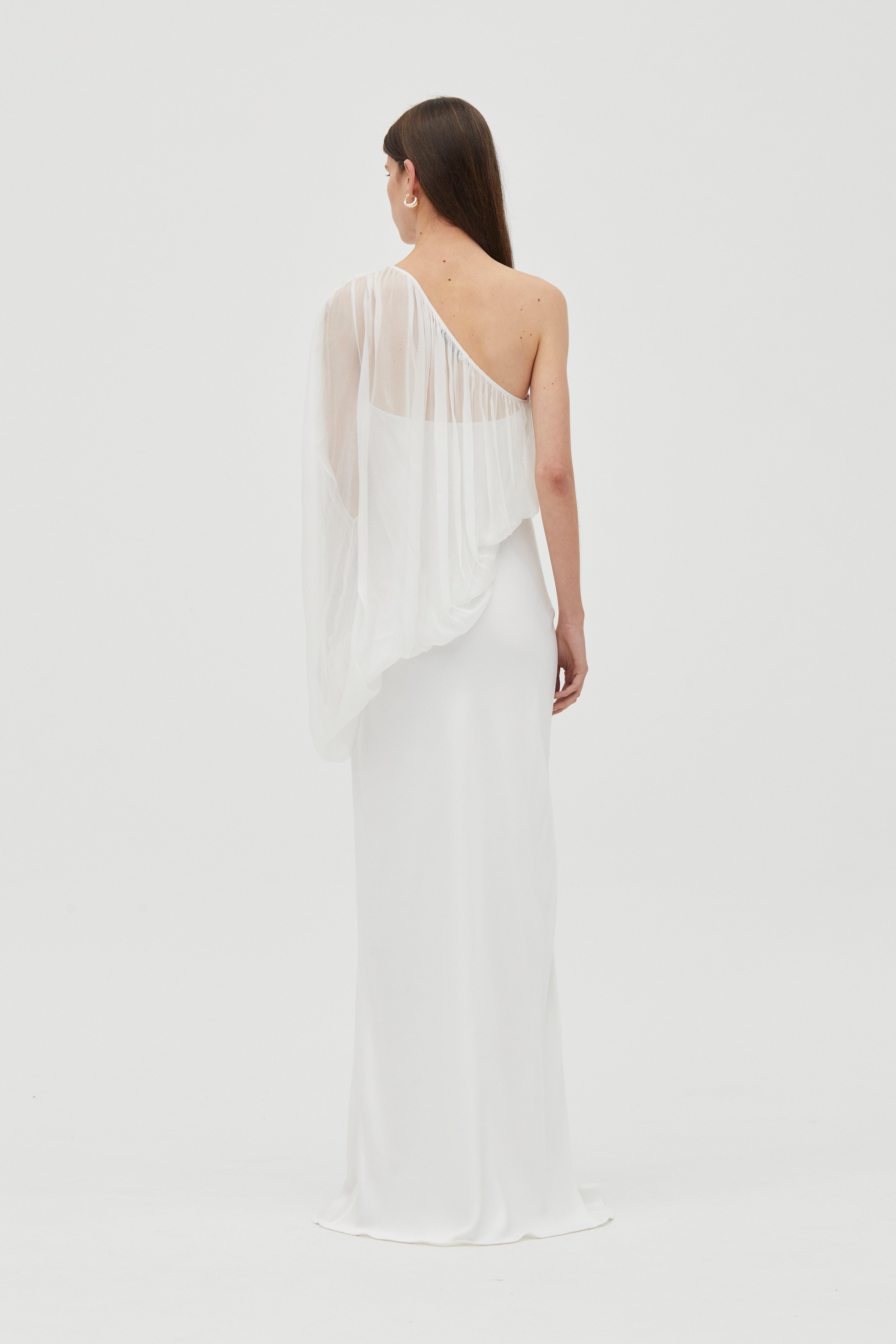 The Solstice One-Shoulder Floor-Length Dress embodies understated luxury with its striking asymmetrical neckline. Softly gathered fabric cascades through the shoulder, neckline, and waist, delivering fluid movement and a delicate crinkled texture. Built on a bias-cut sateen foundation with an ethereal chiffon overlay, this dress glides seamlessly across your frame, offering the perfect balance of structure and flow for an elevated, timeless aesthetic.