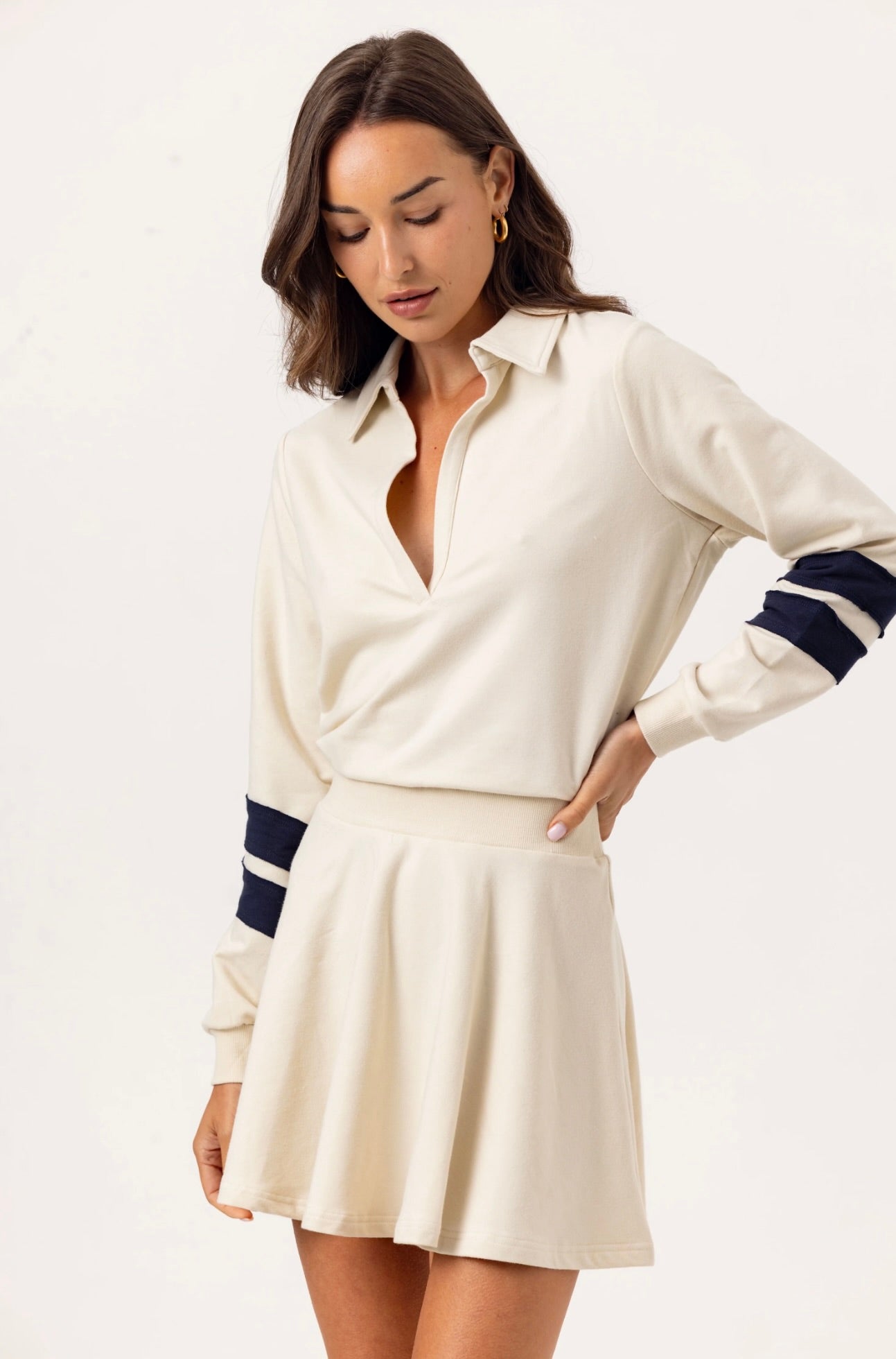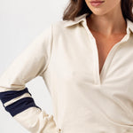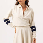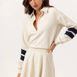 The Scottie Dress captures effortless elegance with its signature polo silhouette and flattering circle skirt design. Crafted in the We Are Sundays coveted lux wash, this piece features a fitted waist that creates a polished, feminine shape. Classic rugby stripes in navy add striking visual interest against ribbed cuffs and waistband, while the V-neck and foldover collar deliver timeless sophistication.
